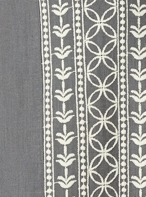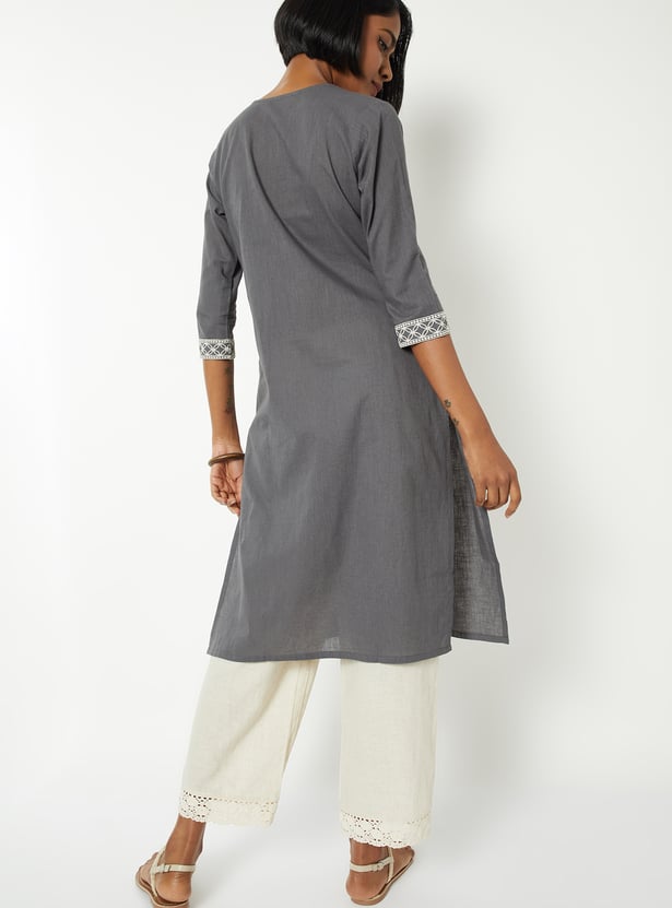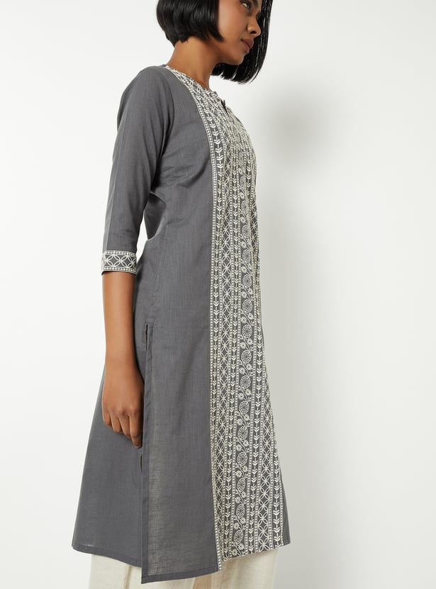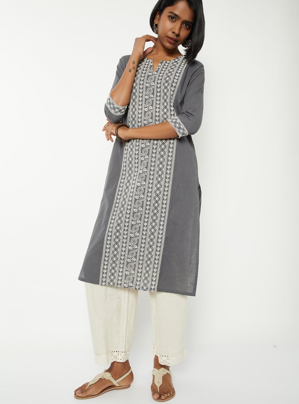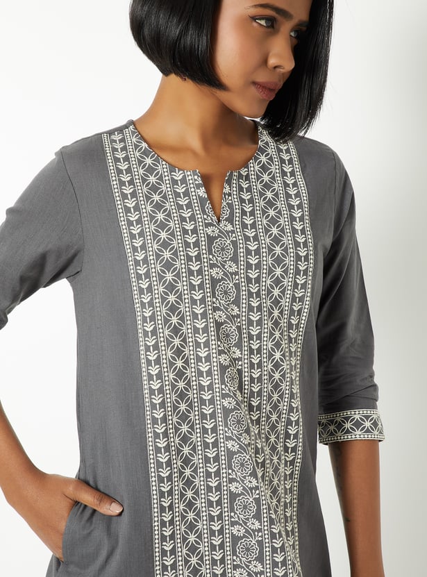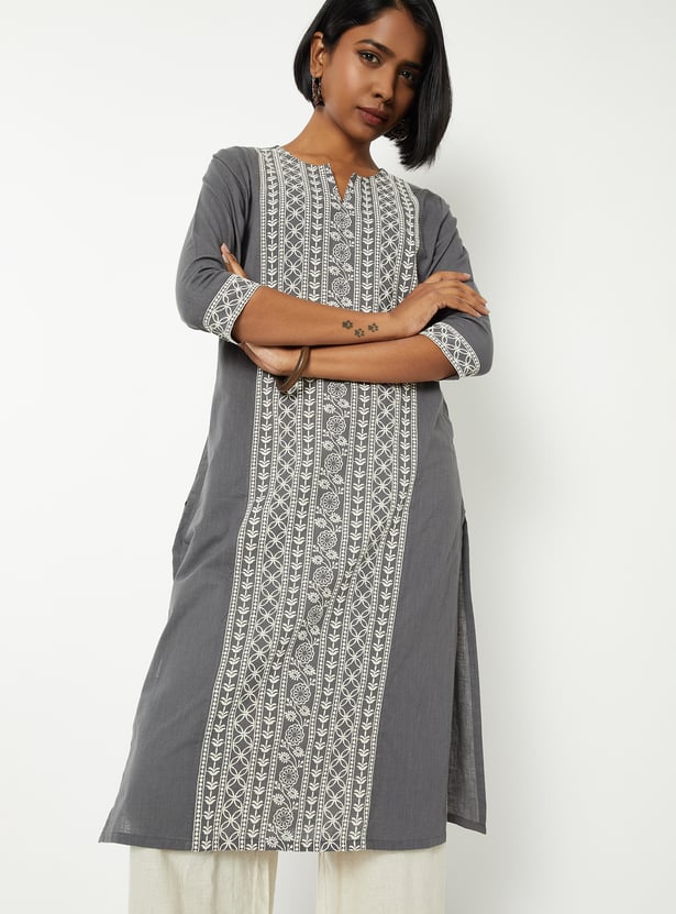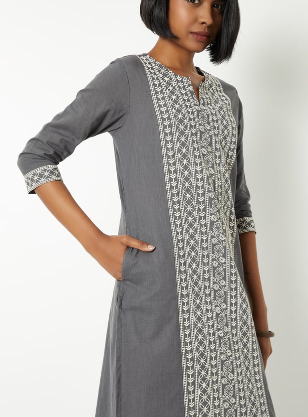 This woman's kurta features intricate white embroidery on the centre panel, adding a touch of elegance to its simple design. Styled with a notched round neck, 3/4th sleeves, and a side pocket, it’s perfect for comfortable daily wear.