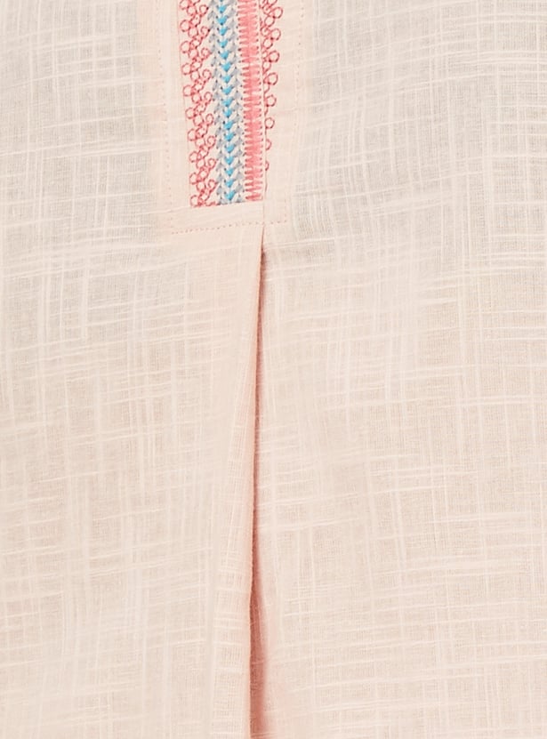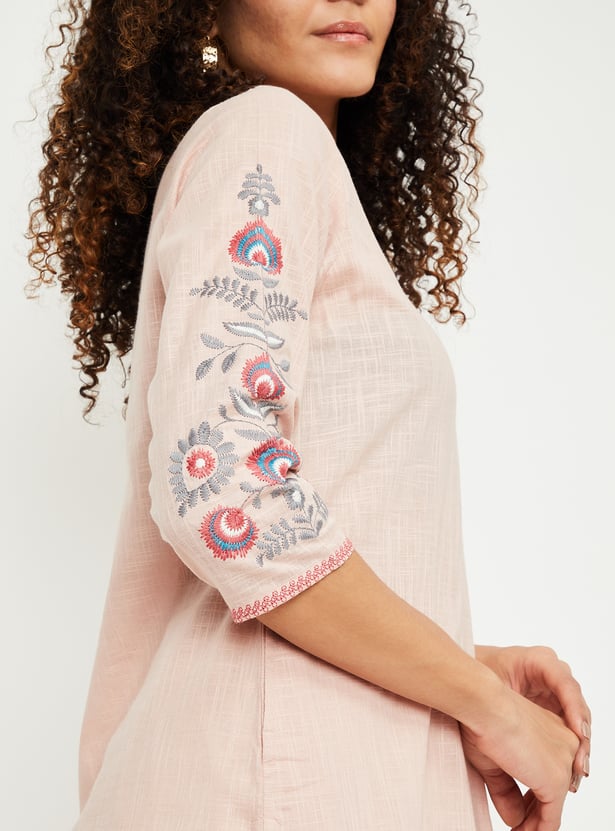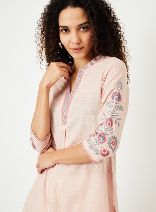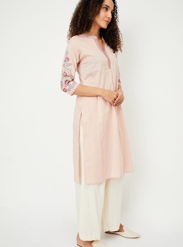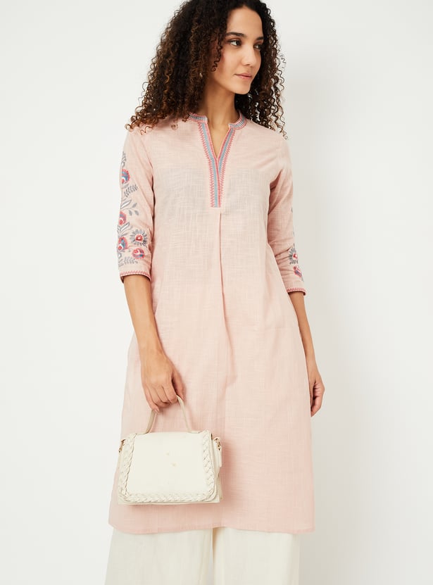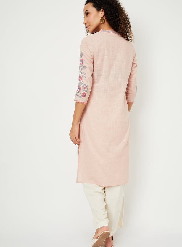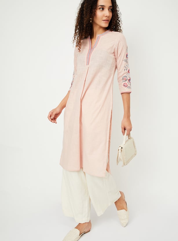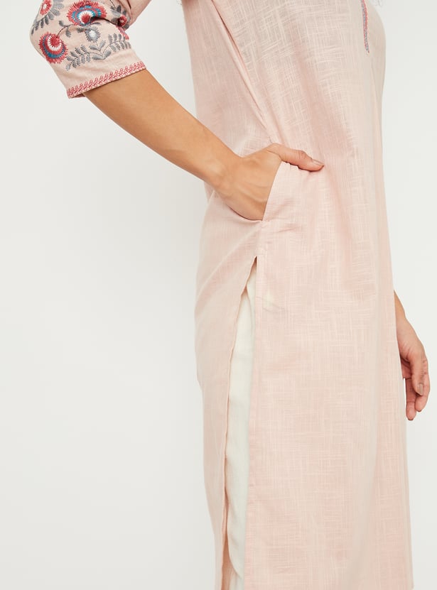 Graceful and comfortable, this kurta is bound to become your go-to option. It features intricate embroidery on the sleeves and neckline, adding a touch of elegance. The three-quarter sleeves, band collar, and straight profile provide a flattering look, while the side pockets offer practical convenience without compromising style.