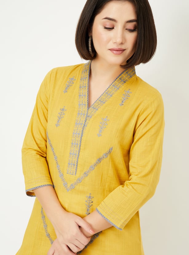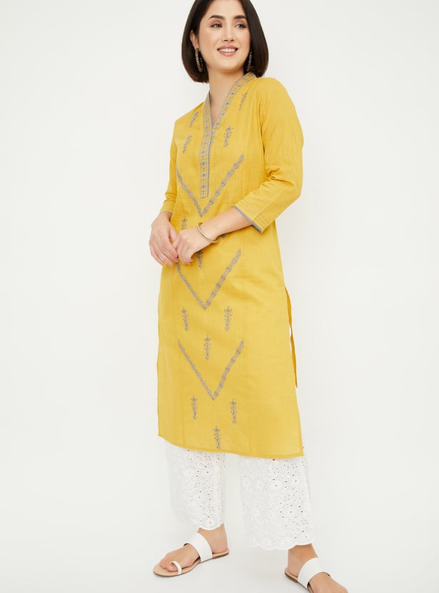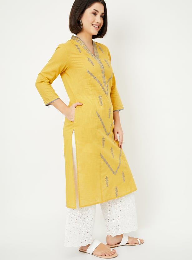 Paint a picture of elegance in this straight kurta. The embroidered detailing adds a sophisticated touch, while the waist pocket offers convenience. It features a V-neck and three-quarter sleeves with lace trim.