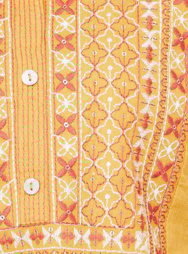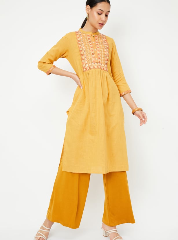 Exude elegance in this straight kurta, featuring a band collar and three-quarter sleeves. The exquisite embroidery on the yoke and cuffs, along with the gathered detail at the waist, lends a touch of sophistication.