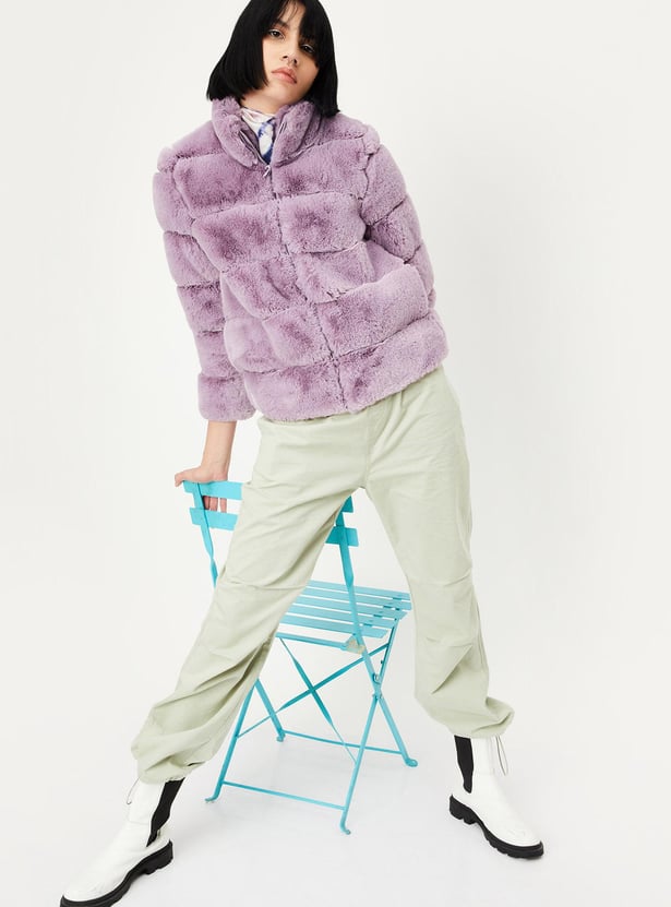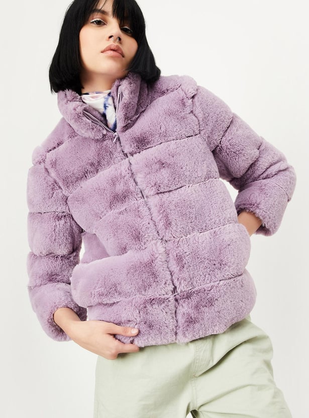 Snuggle up to the plush feel of this jacket this winter. It has a faux fur texture finish, a mock collar, full sleeves, and a quilted design. The side pockets and a zip front add to the convenience. Layer this jacket over a tee and pair it with jeans and boots to trudge through the winter in style.