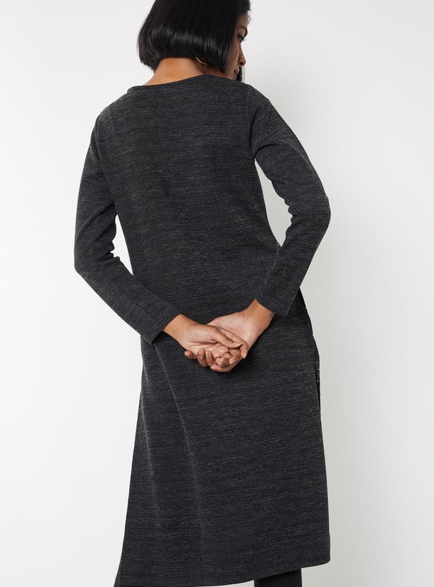Embrace the season in style with this floral knit straight winter kurta, perfect for cool-weather comfort. Featuring a round neck, full sleeves, side slits, and a side pocket, it blends warmth with everyday elegance.