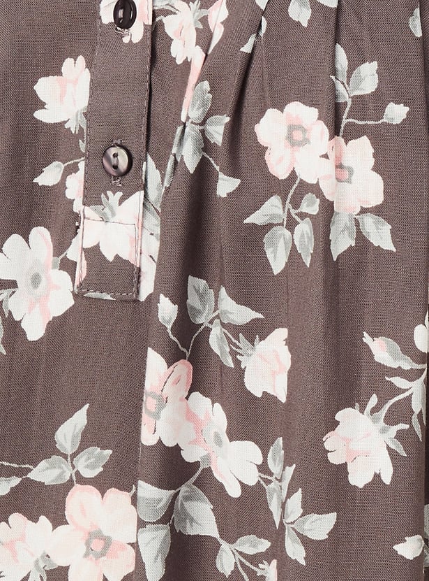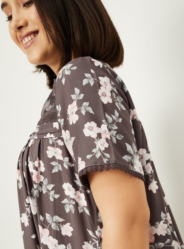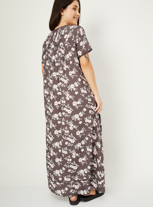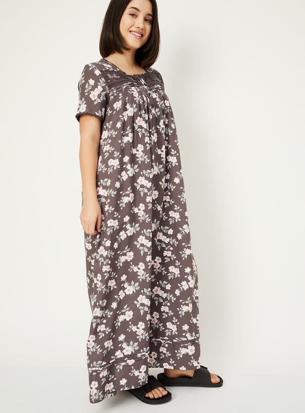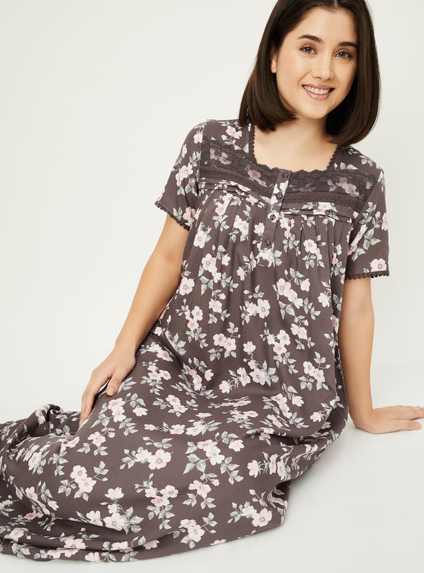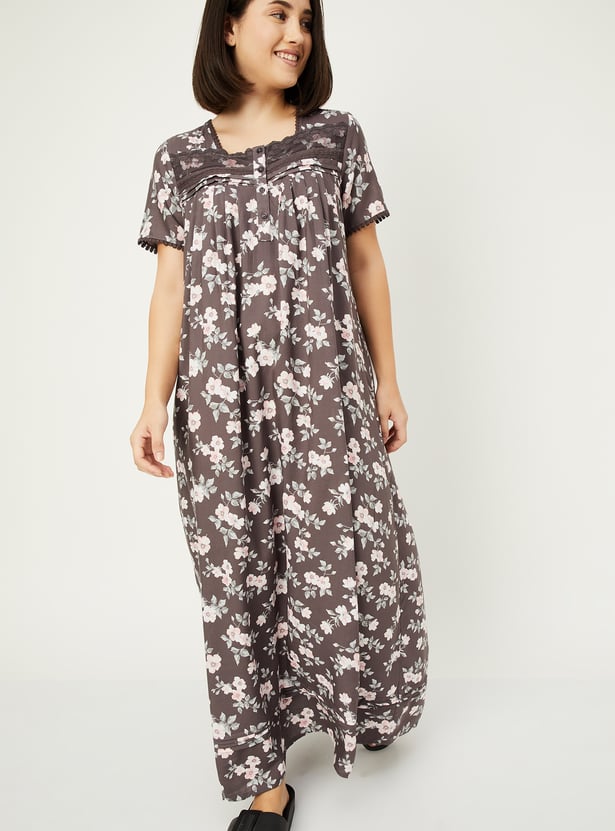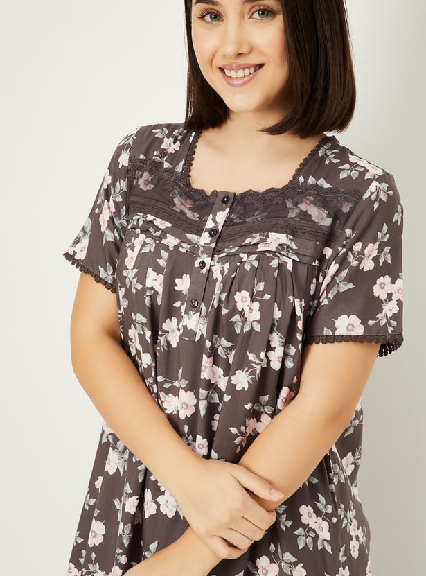 This floral print nightgown blends comfort with a touch of charm, featuring a square neck, half sleeves, and a front button closure. Its relaxed fit and soft fabric make it perfect for a peaceful night's sleep. Model Size :
