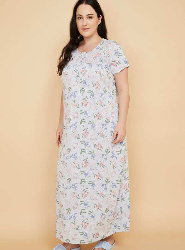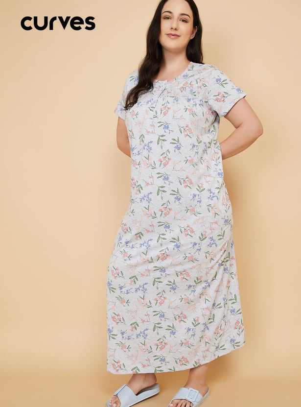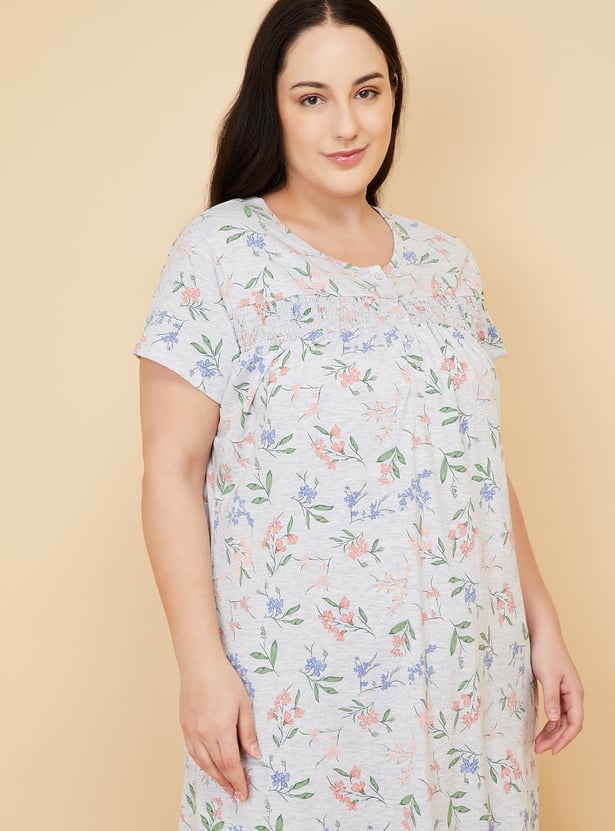 This floral print nightgown features a soft round neck, half sleeves, and a button placket, with smocked detailing across the yoke for gentle texture and ease. The full-length silhouette offers comfort and charm, making it perfect for relaxed, restful nights.
