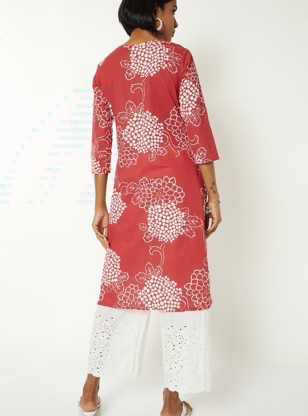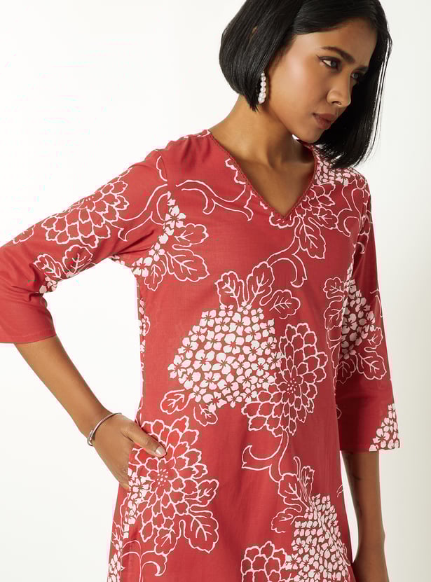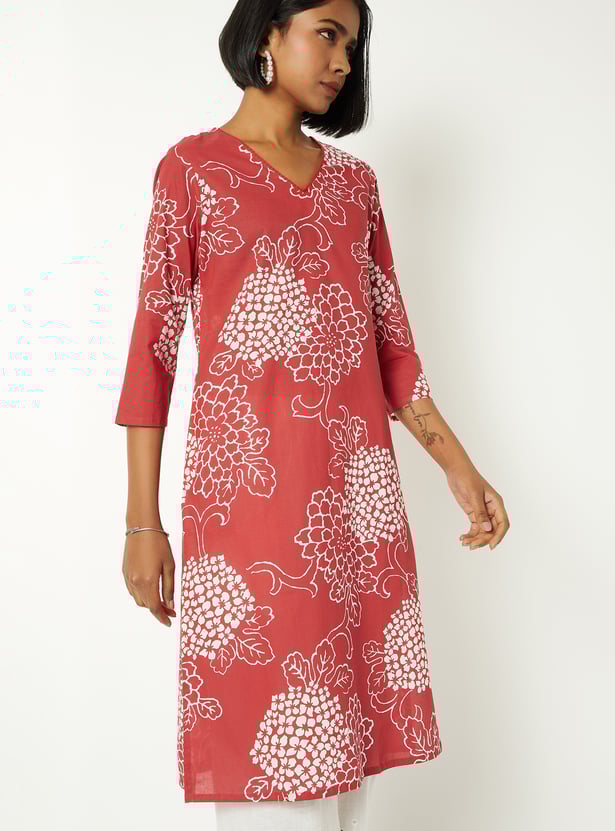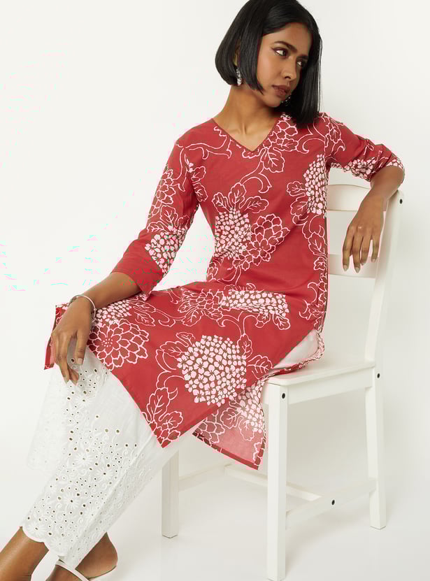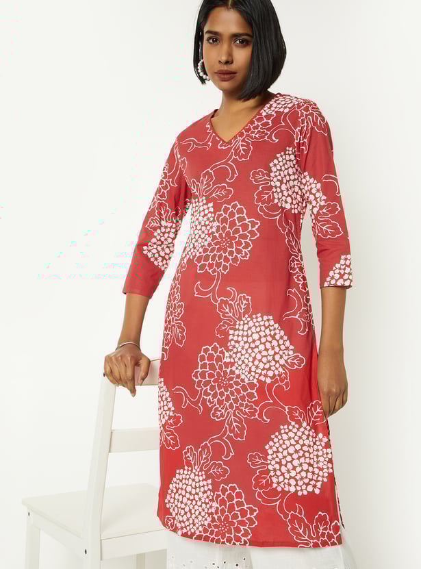 Step out in graceful style with this floral print straight kurta. Featuring a V-neck, three-quarter sleeves, a pocket, and side slits, it combines elegance with a comfortable fit.