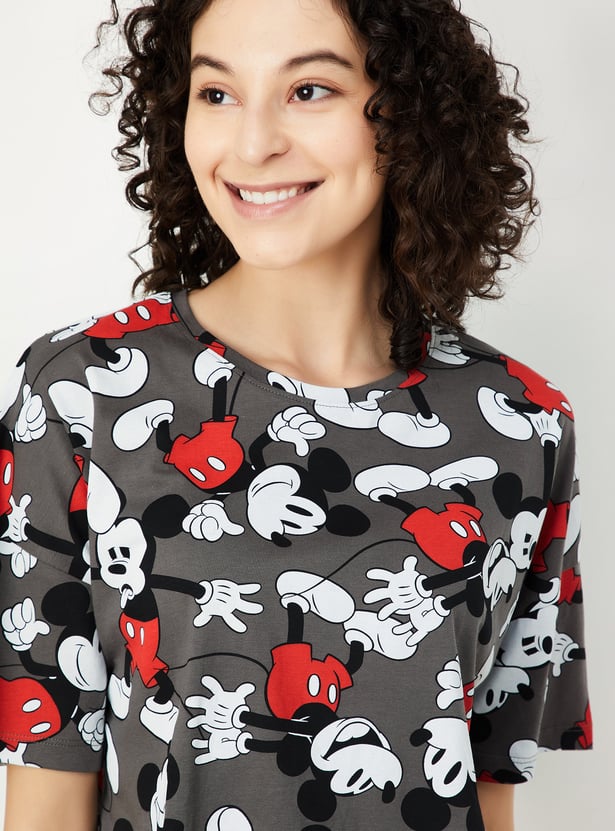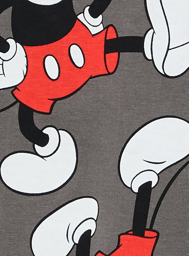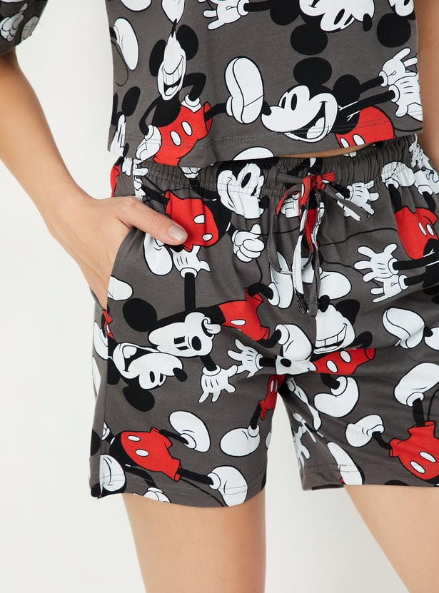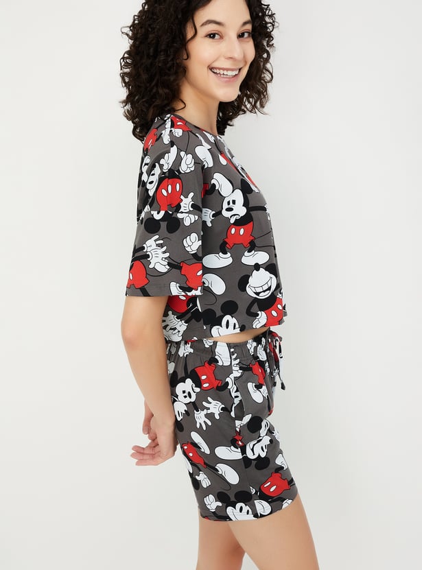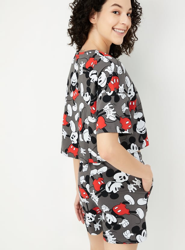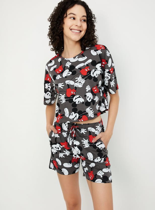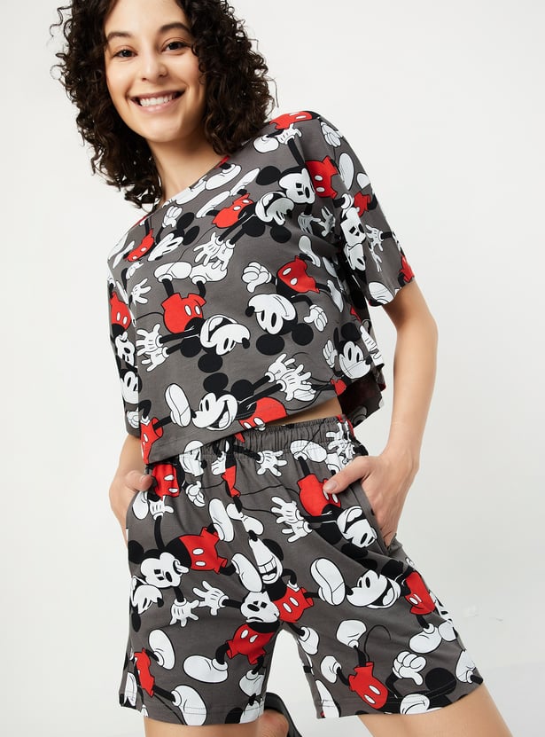 Induce comfort and style with this set featuring all-over Mickey Mouse prints. It includes a cropped T-shirt designed with a round neck, drop shoulders, and half sleeves, paired with matching shorts that have an elastic waist and drawstring for a customized fit.