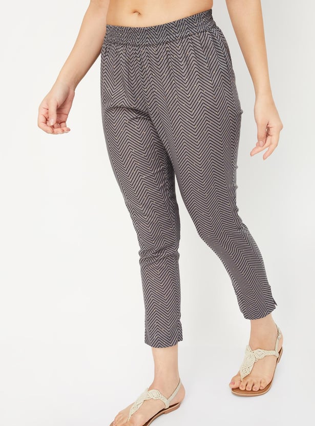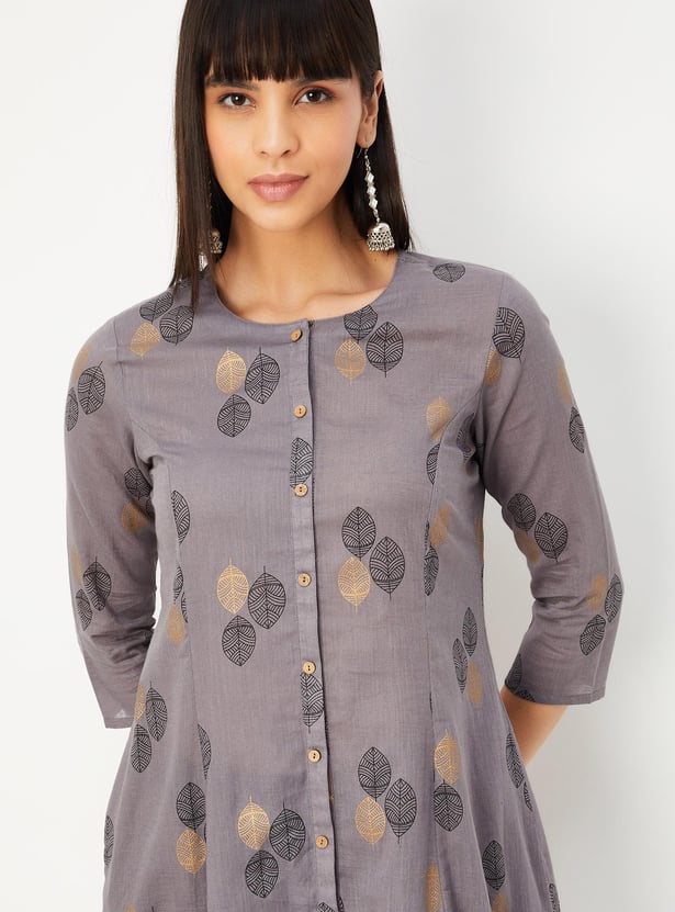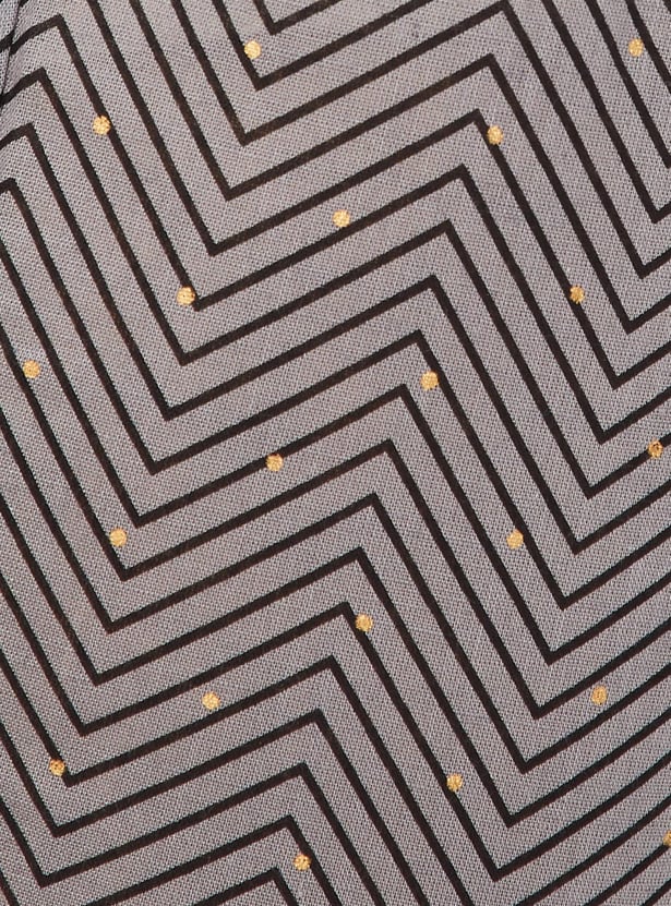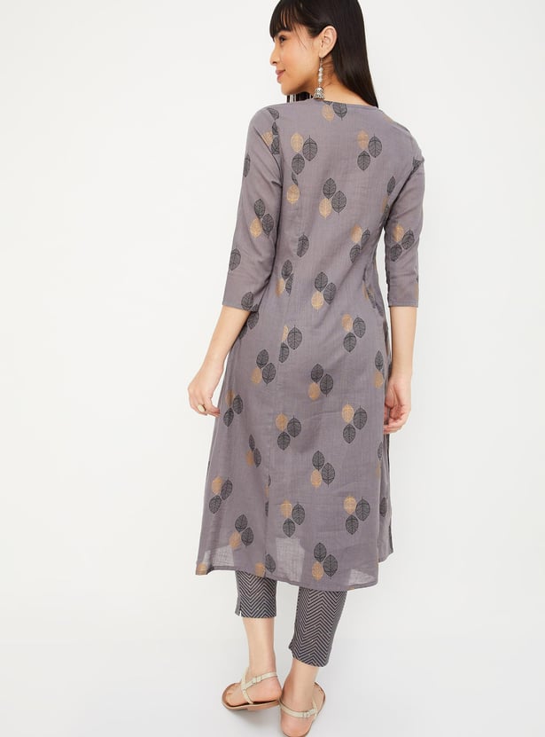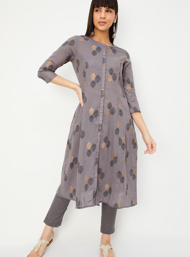 Flaunt your simplicity and elegance with this ethnic set. It includes an A-line kurta with a round neck, three-quarter sleeves, waist pockets, and a front button placket. This pair of straight pants has an elasticated waist, chevron prints, and foil dots.