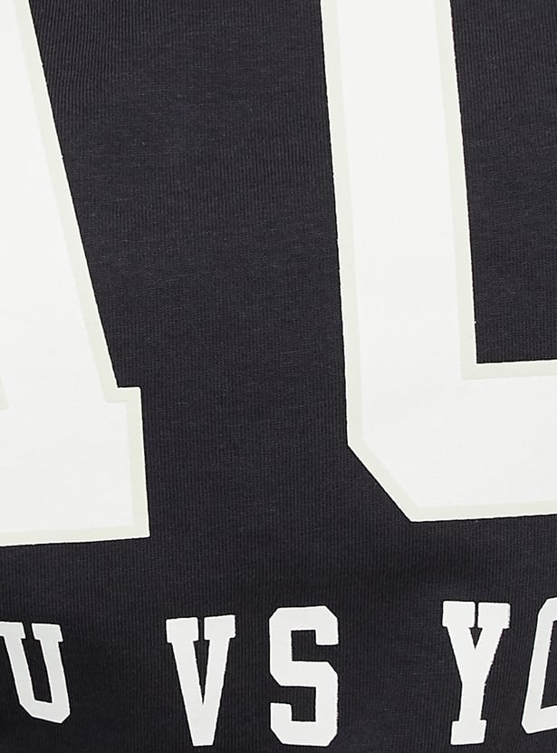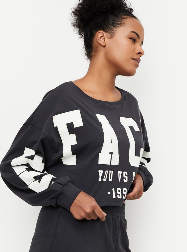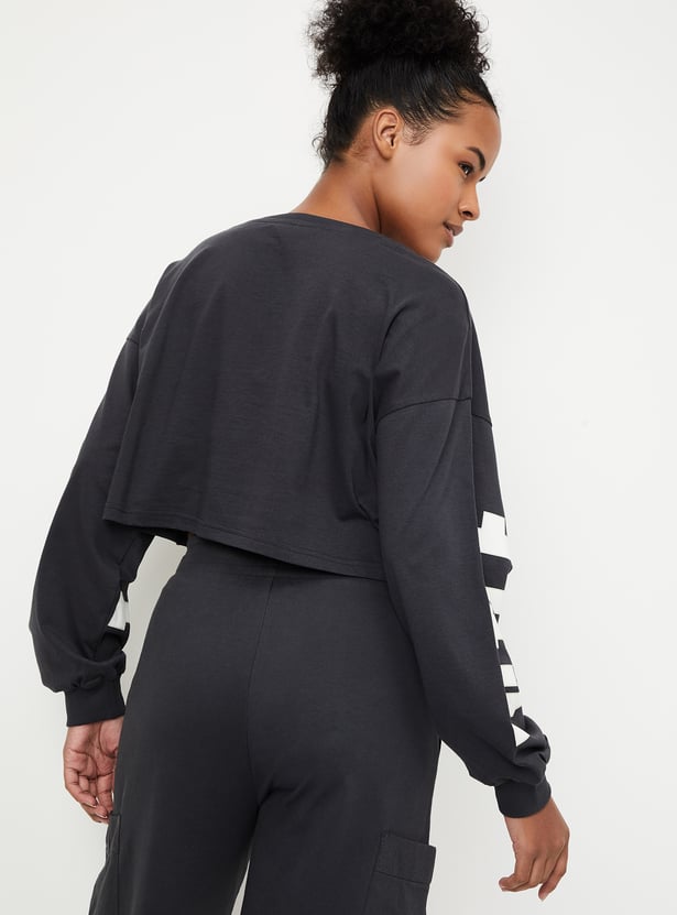Add a stylish twist to your casual collection with this cropped T-shirt. It features a bold typographic print, a round neck, and full sleeves, creating a modern and eye-catching look. Perfect for making a statement while keeping it laid-back.