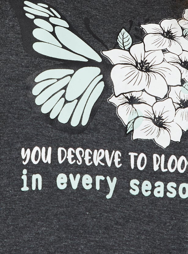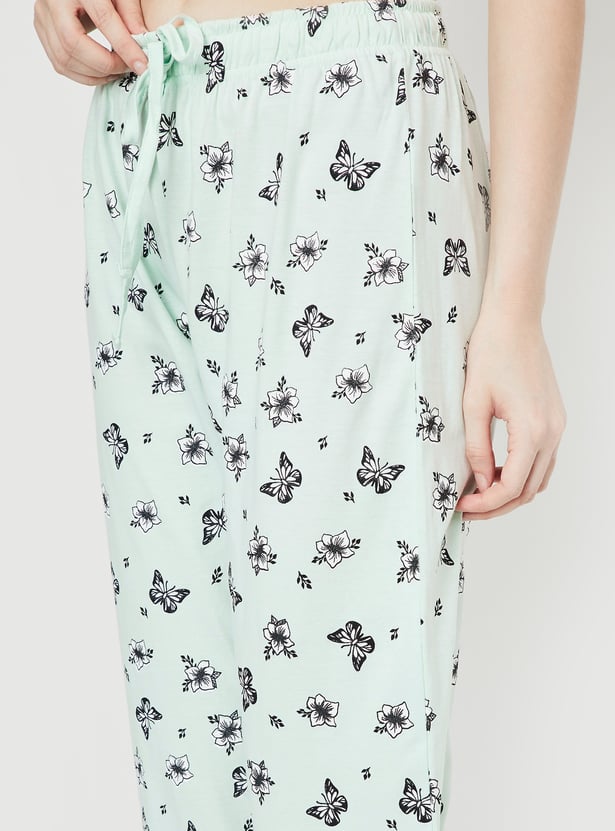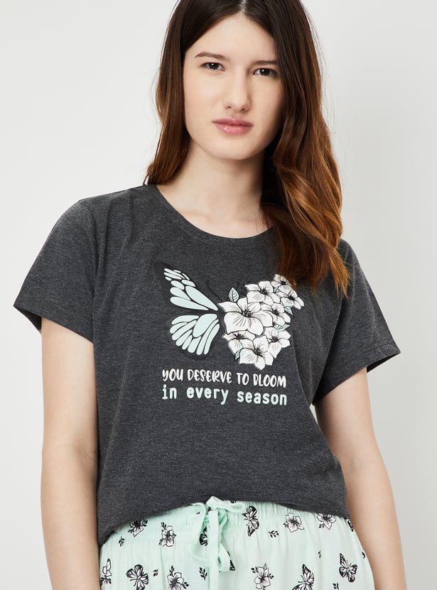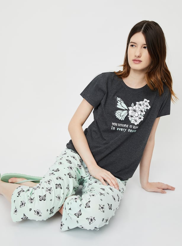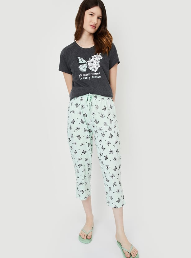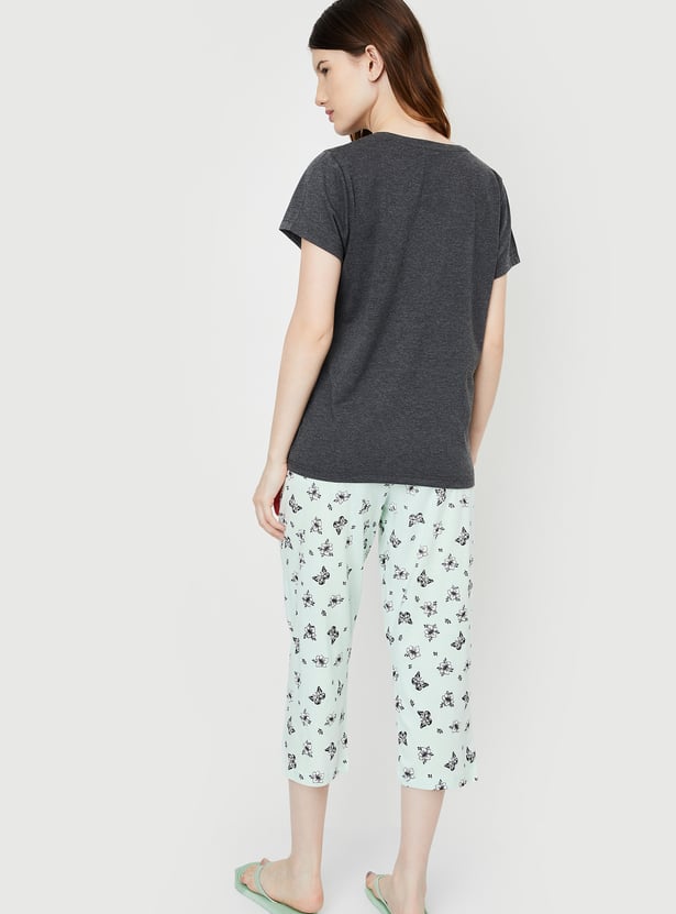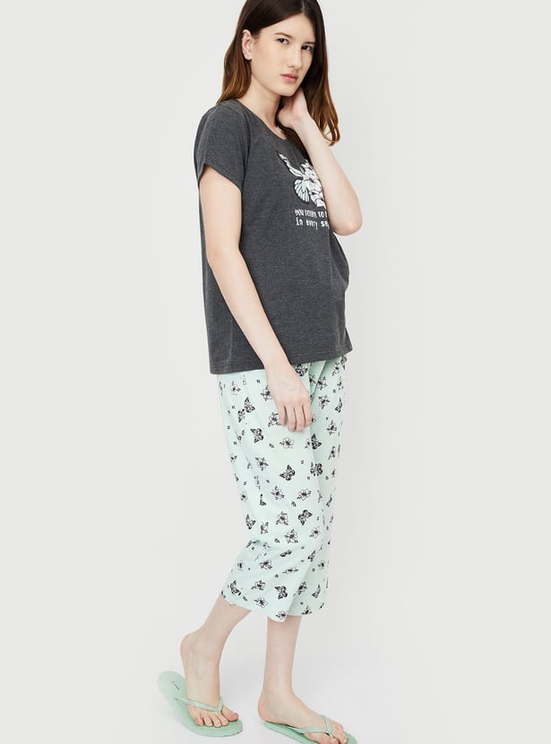 Dive into dreamland with this cosy set. It includes a tee with a round neck, half sleeves, and a graphic print on the front. The matching capris feature all-over prints, a drawstring waist, and a cropped profile, making it perfect for a comfortable and stylish night's sleep.