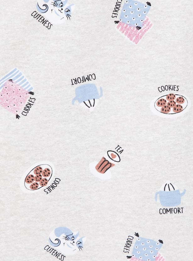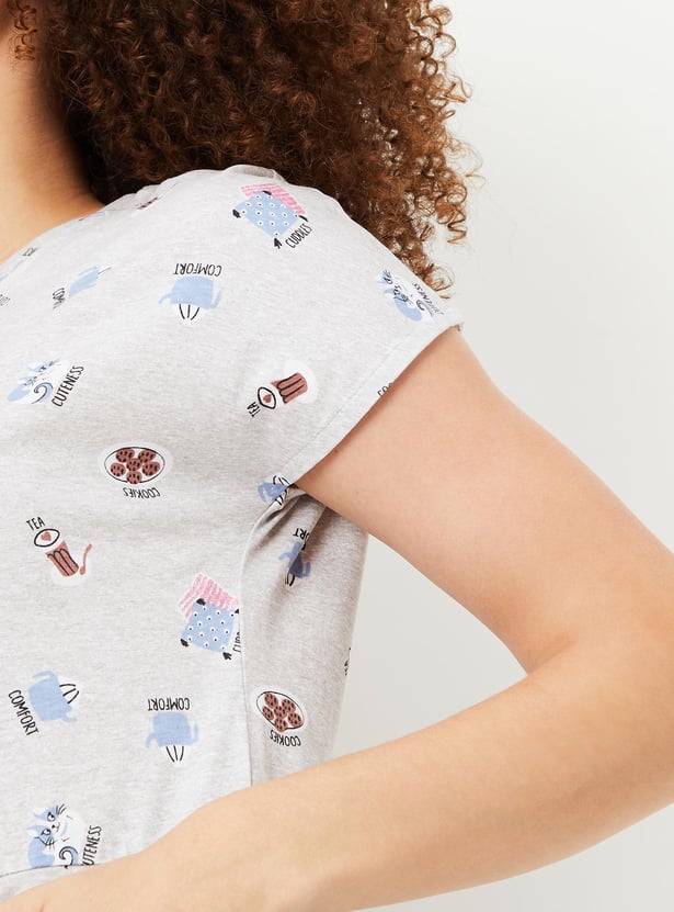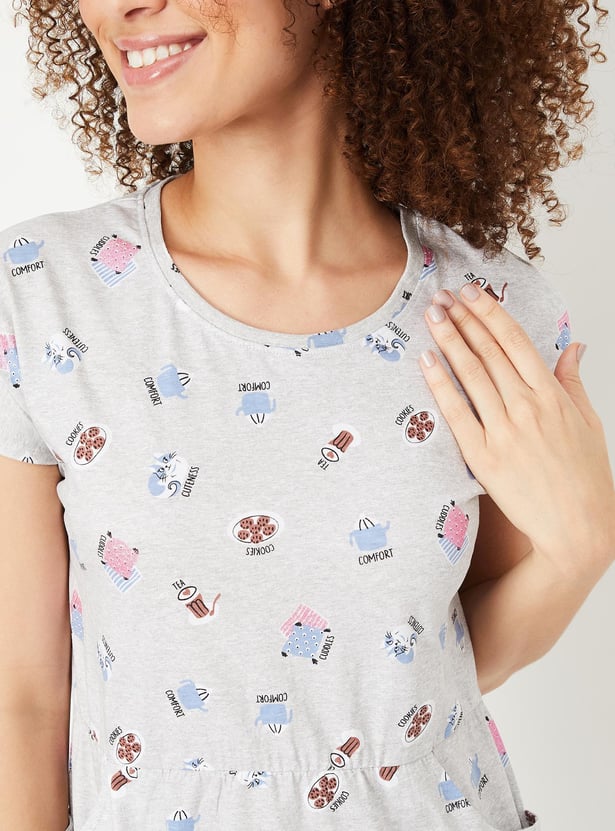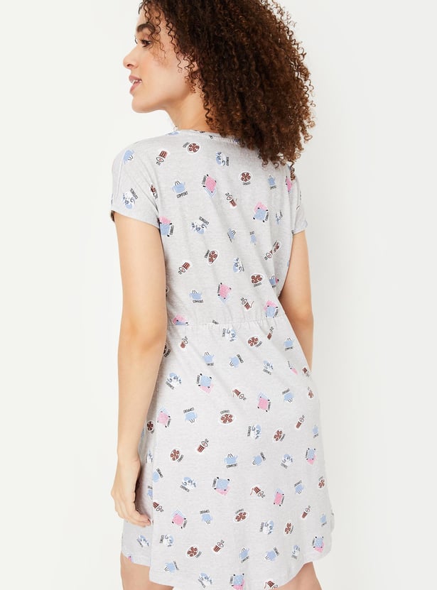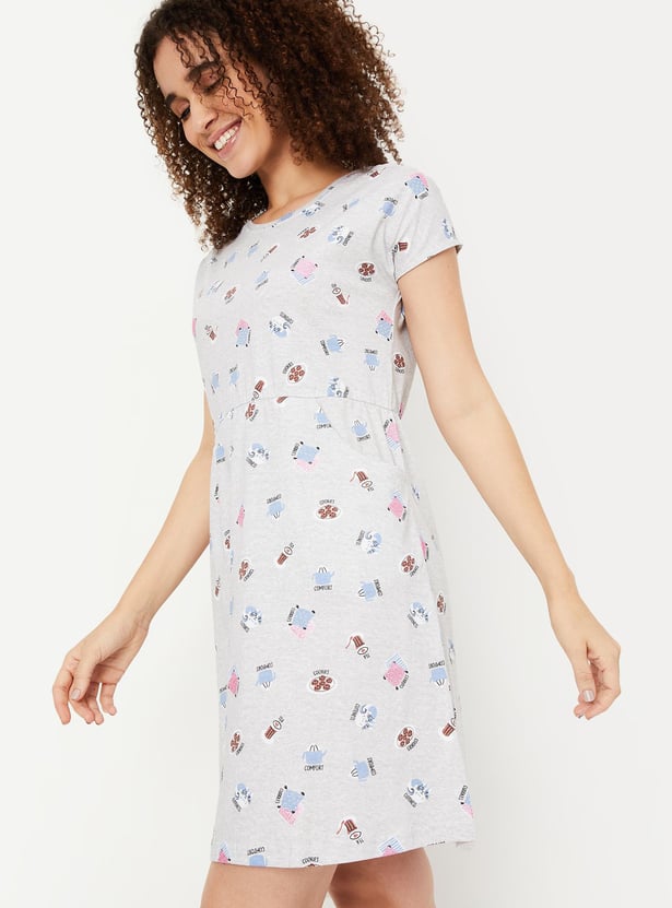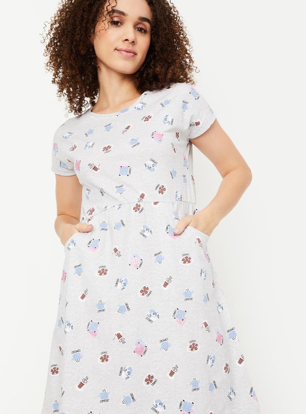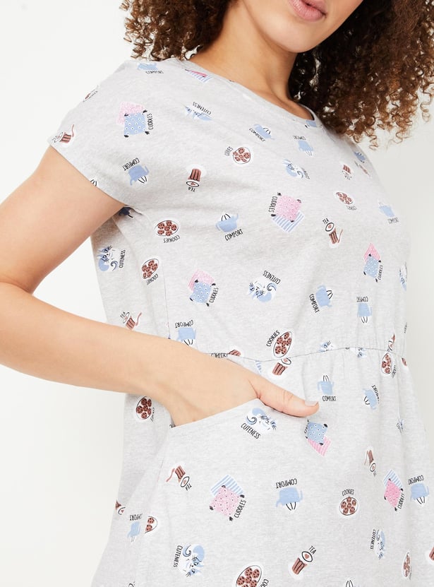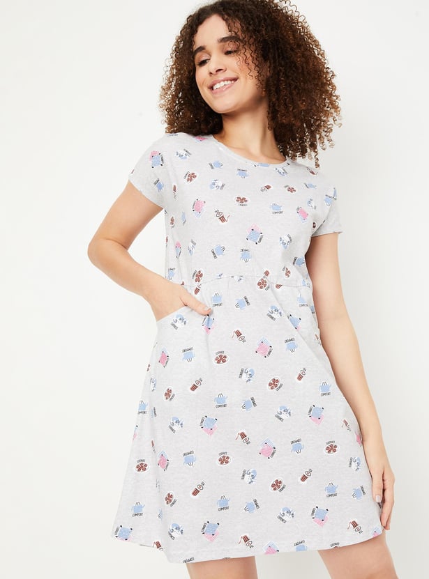 Relax and chill at your home with this chemise featuring a round neck, short sleeves, pockets and a printed design all over.