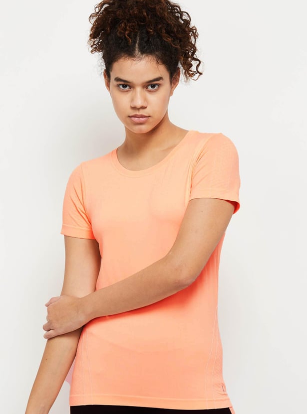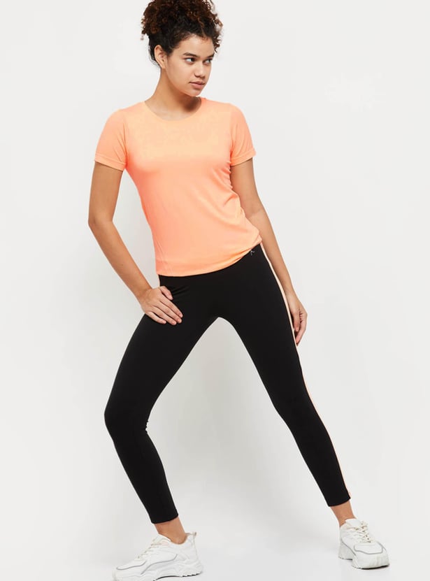 Be workout ready in this printed t-shirt that has a crew neck and short sleeves. Pair this with solid leggings for a dynamite gym style.