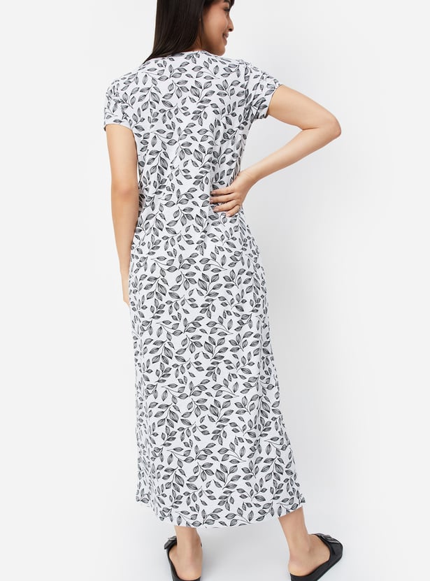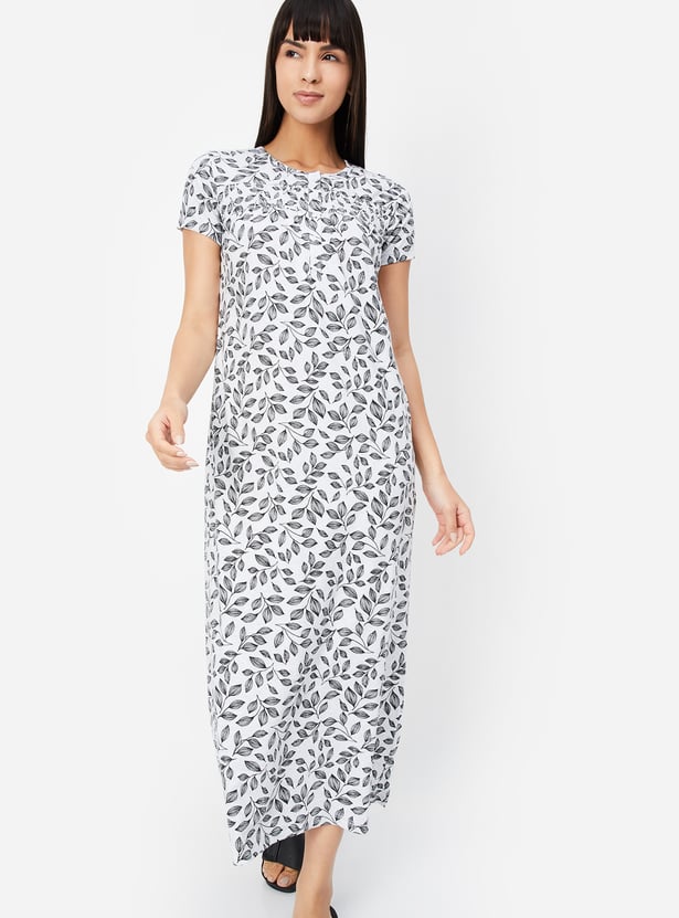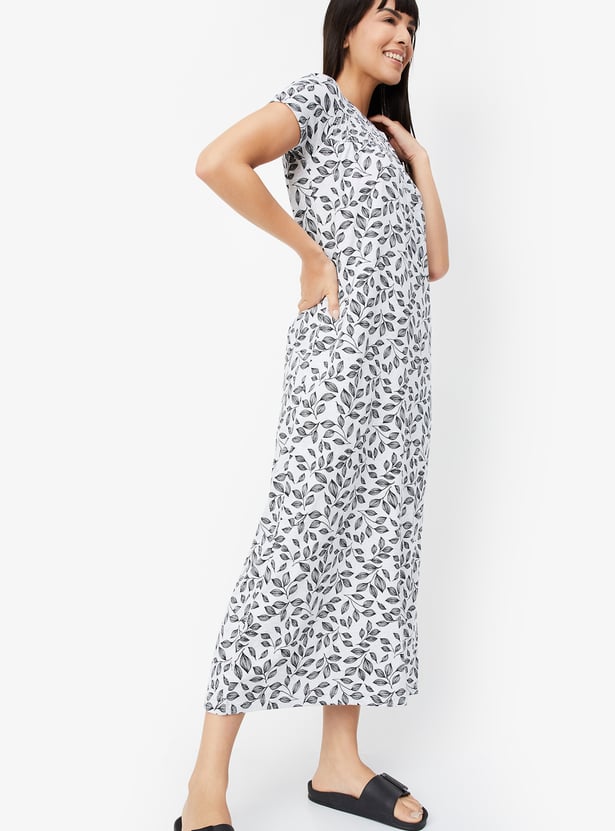 This printed gown brings a blend of comfort and charm to your wardrobe. Featuring a round neck, half sleeves, and a button placket, it offers an easy, flowy silhouette perfect for relaxed days or cozy evening