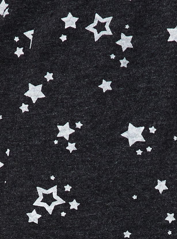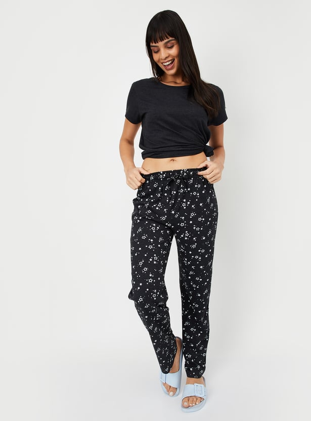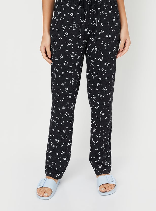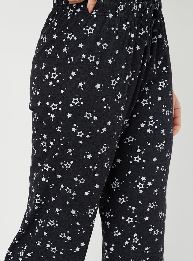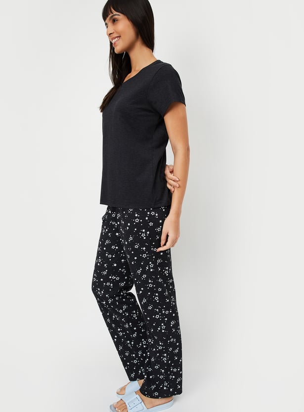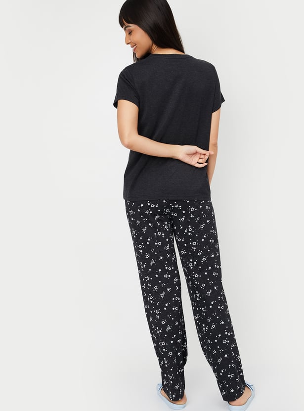 Stay comfy and stylish with this printed PJ set, perfect for lounging or a good night's sleep. The T-shirt features a round neck and half sleeves for a relaxed fit, while the matching pyjamas come with a drawstring closure for adjustable comfort.