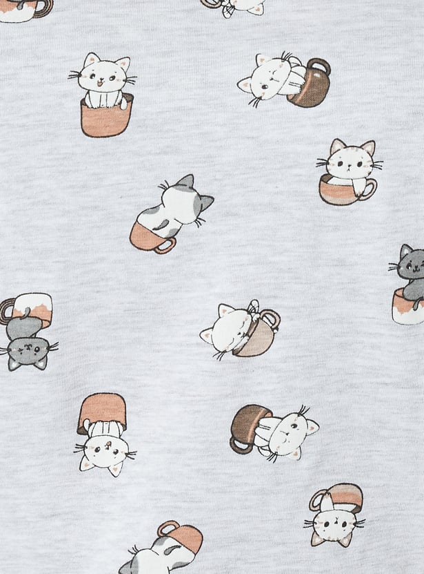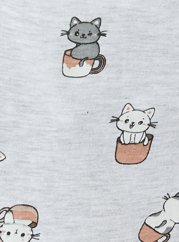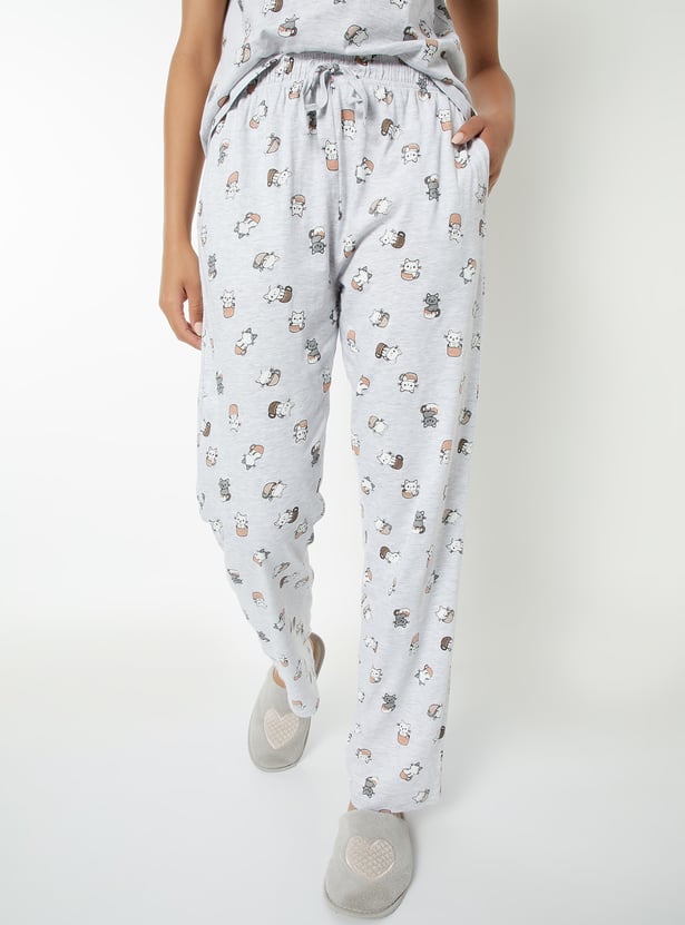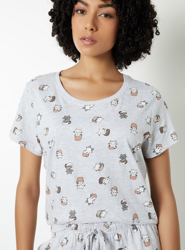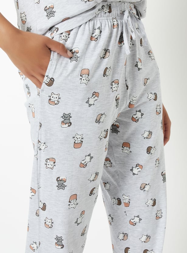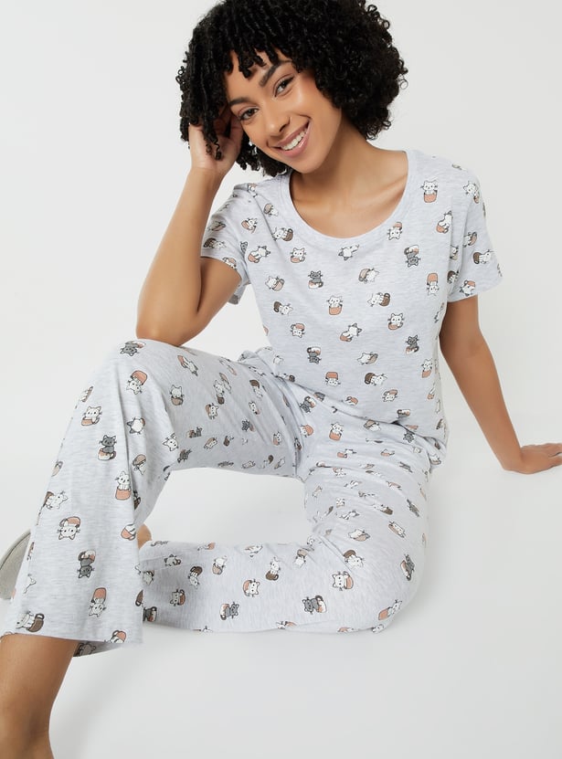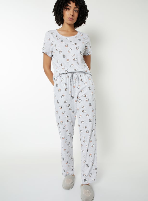 Bring fun to your loungewear with this printed PJ set. The T-shirt features a classic round neck and half sleeves, while the matching joggers come with a drawstring waist and handy pockets for ultimate comfort. Model Size :