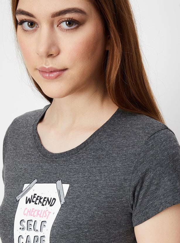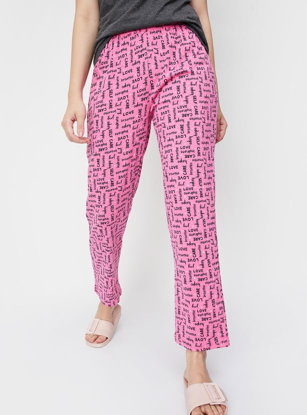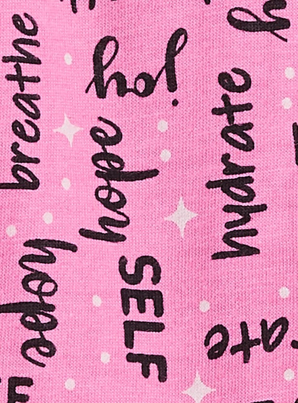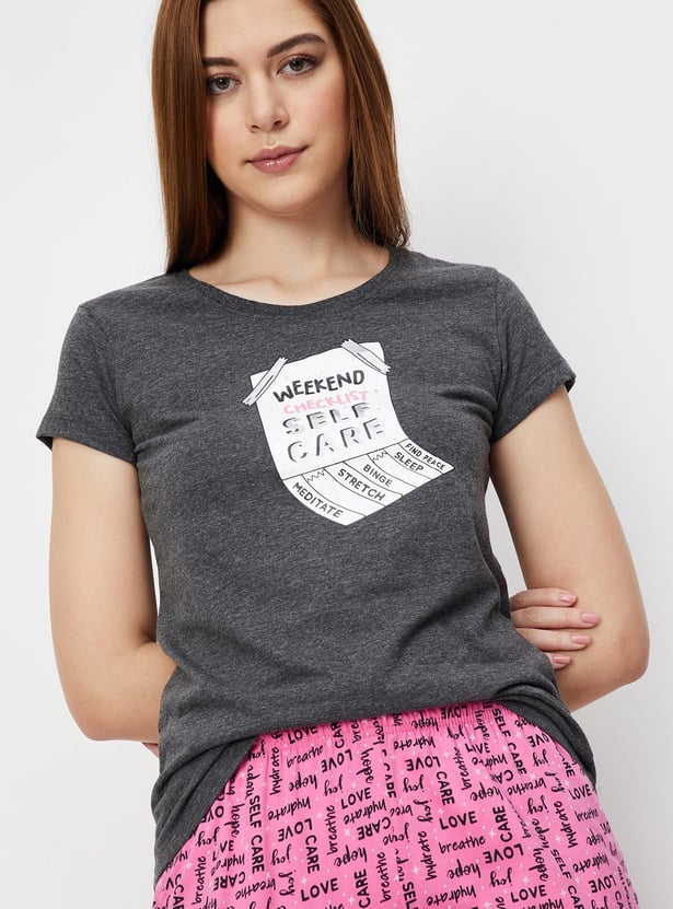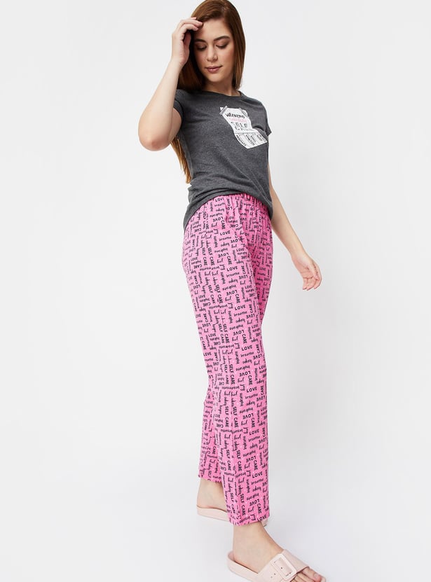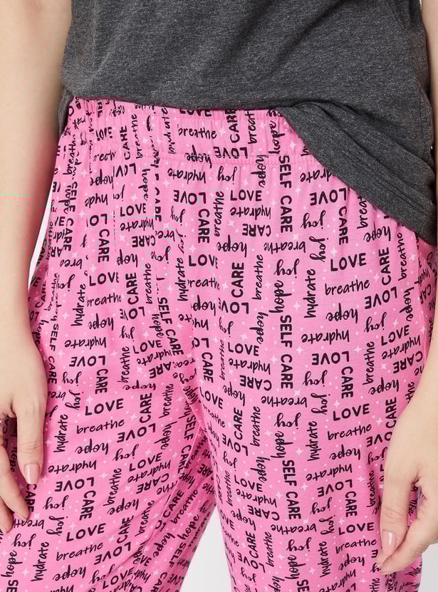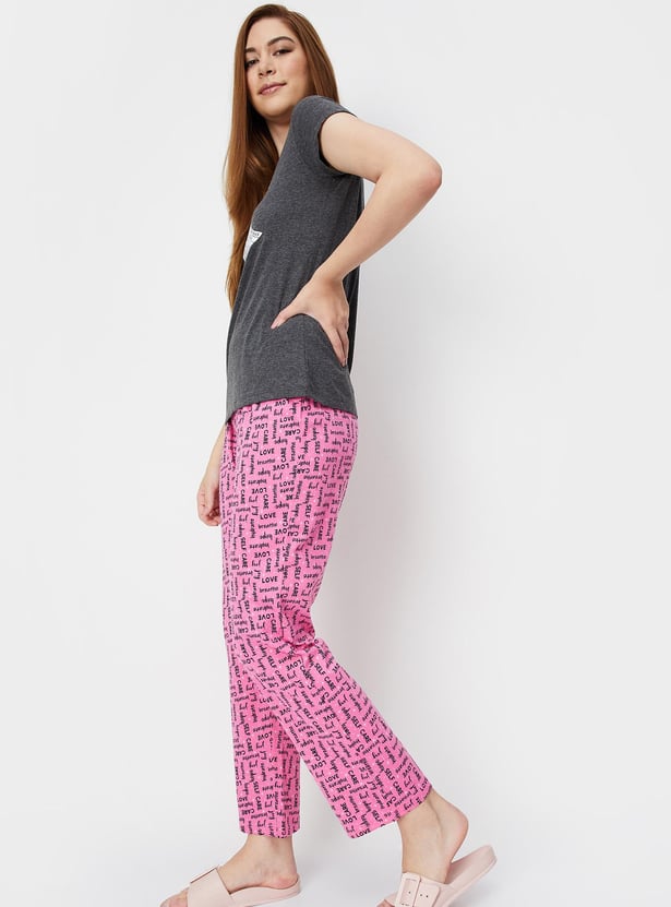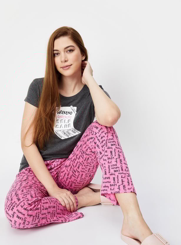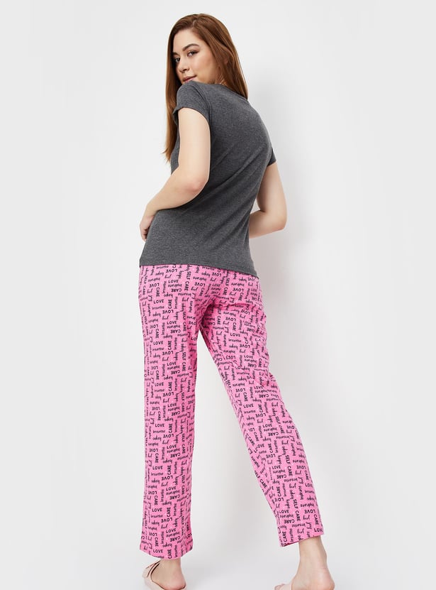 Stay comfy and stylish at home in this sleepwear set. It features a graphic printed T-shirt with a round neck and short sleeves. The pair of pyjamas feature all-over prints, a drawstring waist, and a full-length profile.