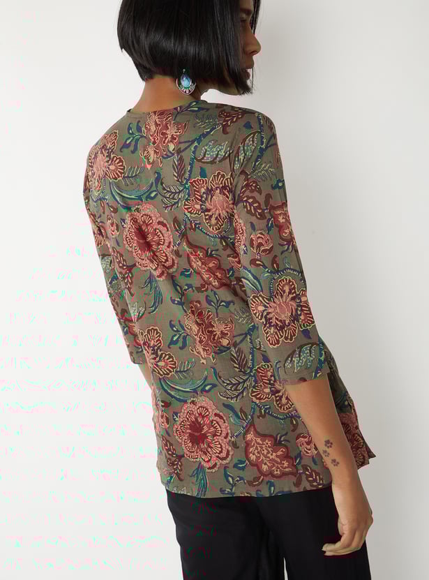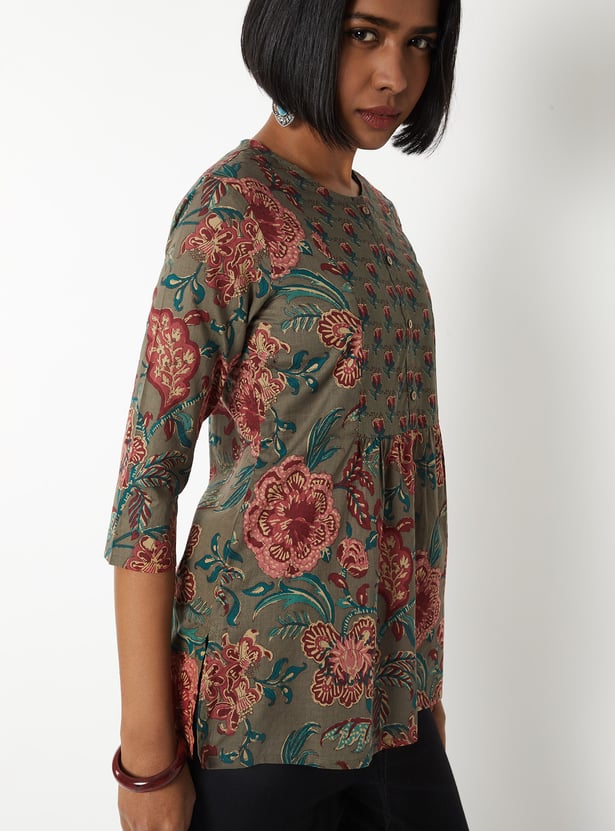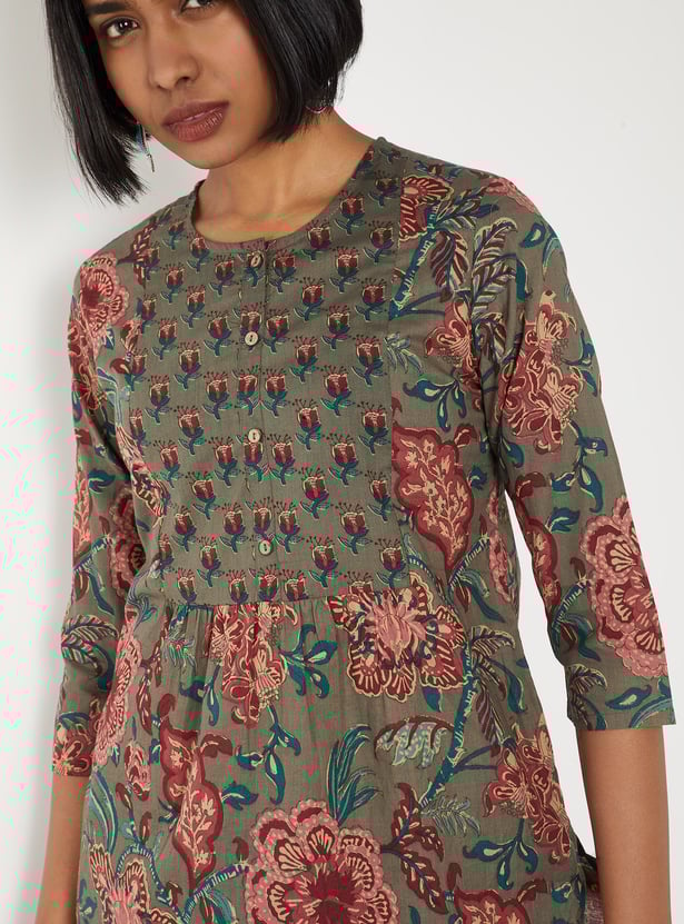 This printed kurti is a versatile everyday piece with a touch of charm. Featuring a round neck and 3/4th sleeves, it offers a comfortable fit with a classic silhouette. Side slits add ease of movement, making it both stylish and practical.