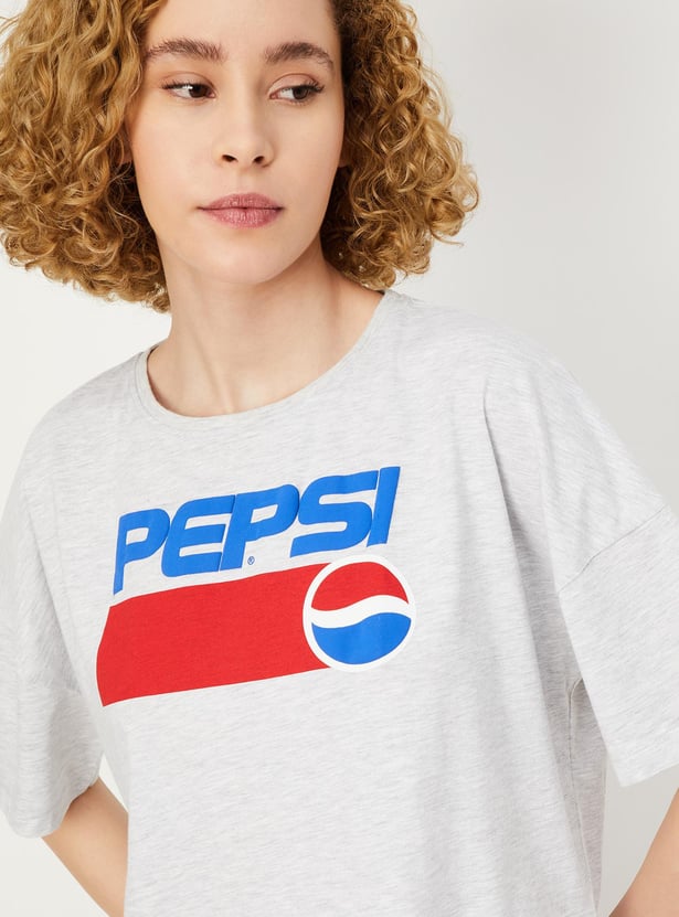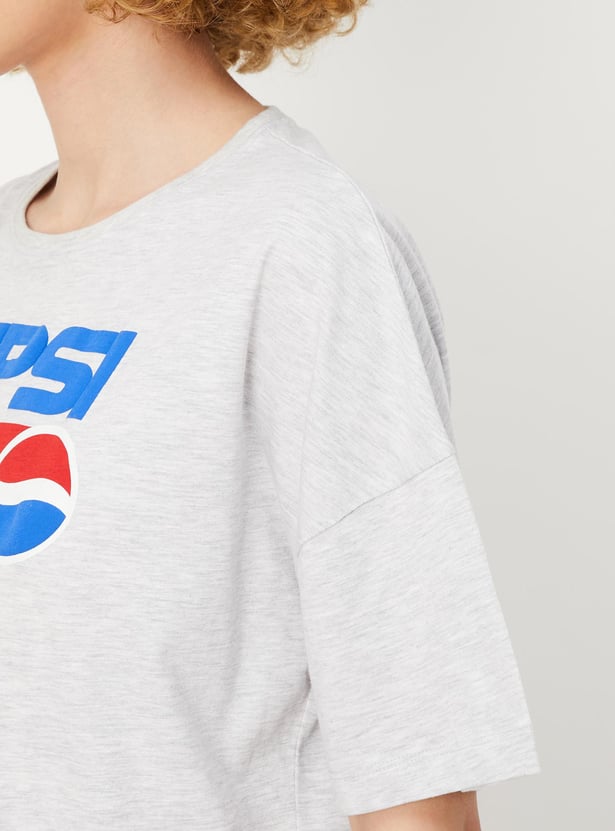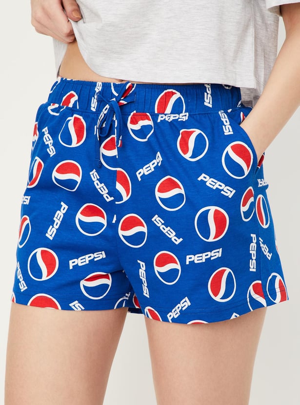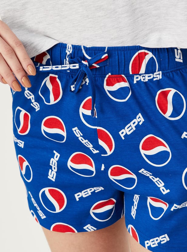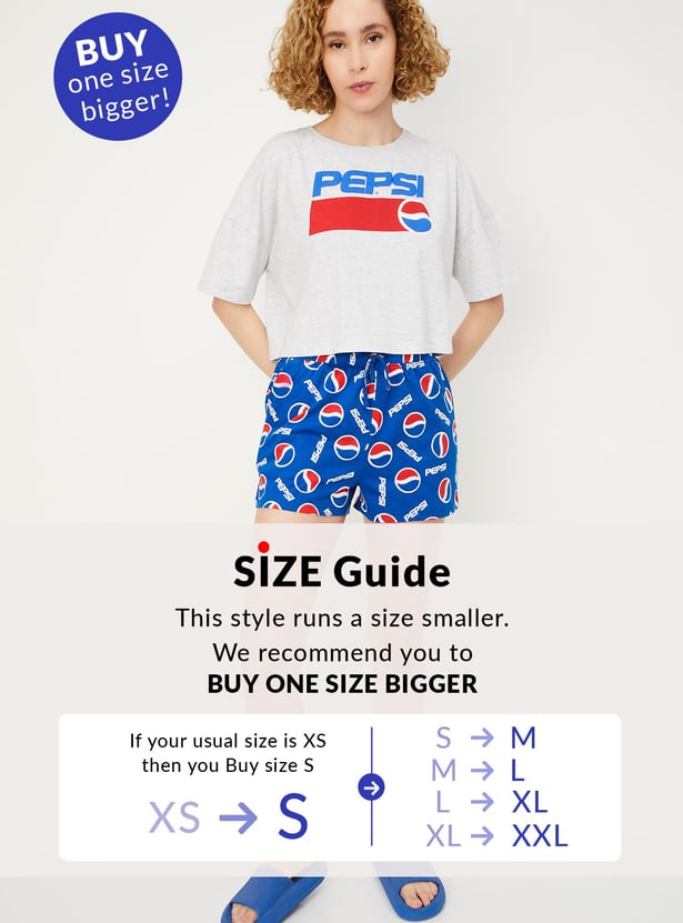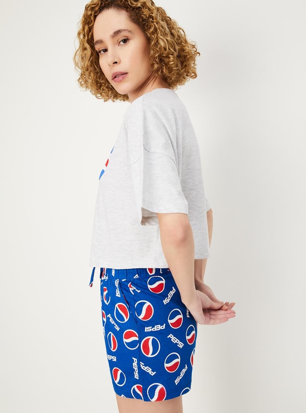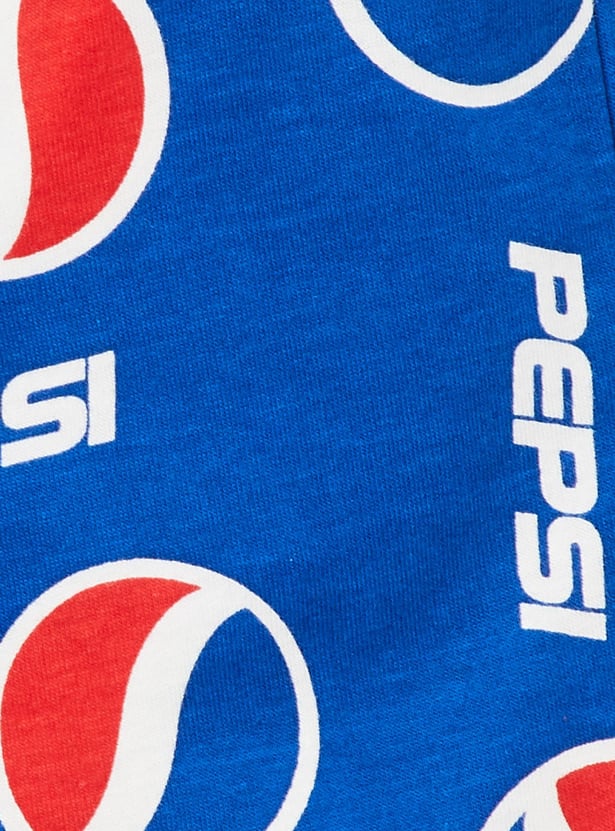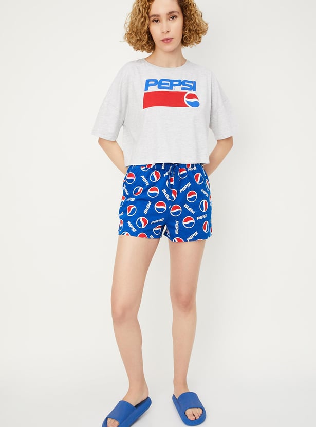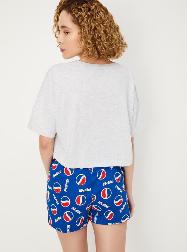 Updated with Pepsi prints this sleepwear suit exudes comfort. It includes a T-shirt with a round neck and short sleeves. The pair of matching shorts come with an elasticated waist.