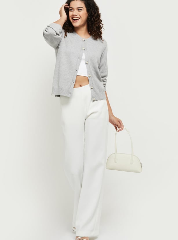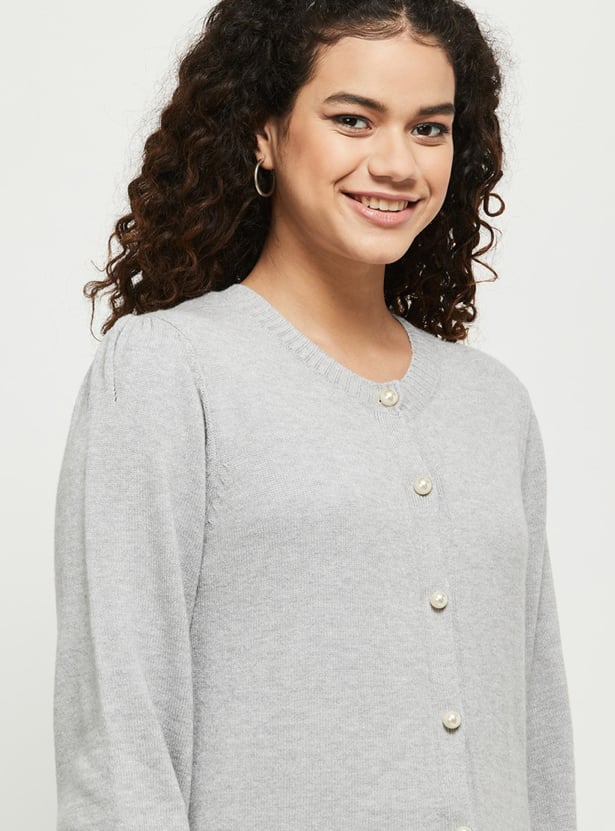 Breeze through the winter with style. This cardigan is designed and detailed with solid tone, ribbed neck, button closure, and full sleeves. For your functional and fashion perfect winters, style it over a long top, kurta, or tunic, paired up with complementing pants.