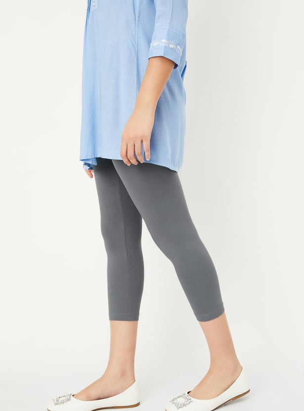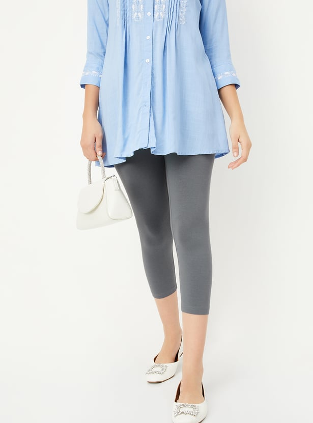 These calf-length leggings feature a comfortable elasticated waistband and a sleek, solid surface. They provide a flattering fit and freedom of movement, making them ideal for both active and casual wear.