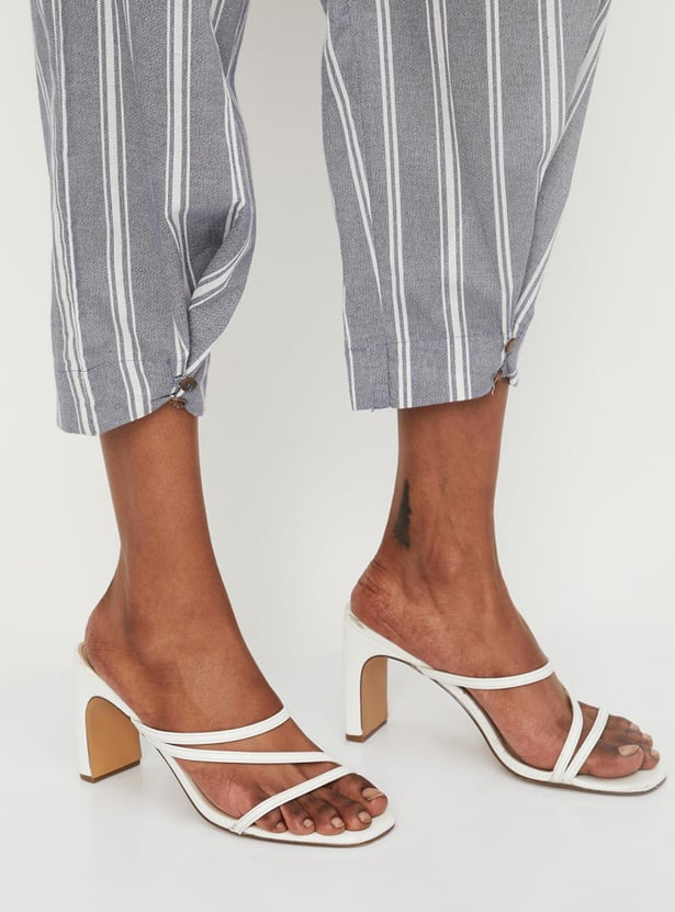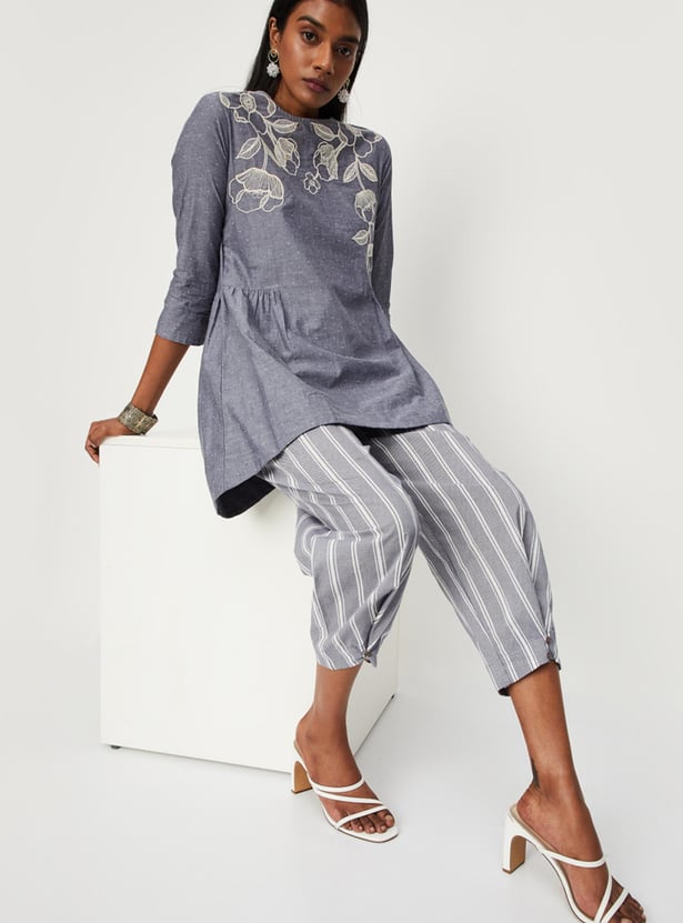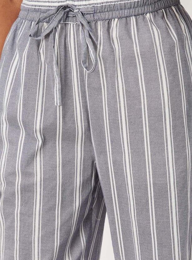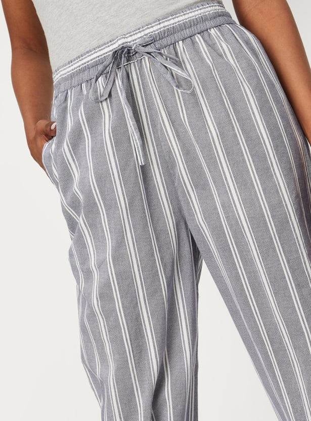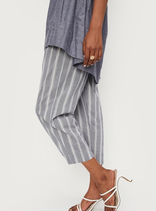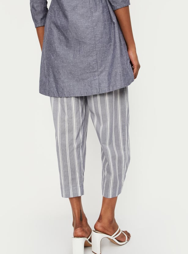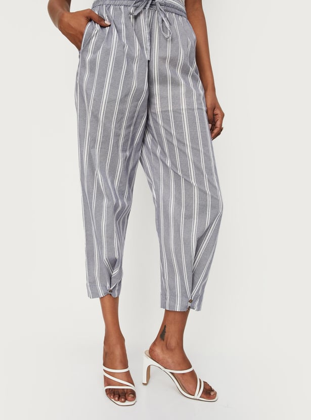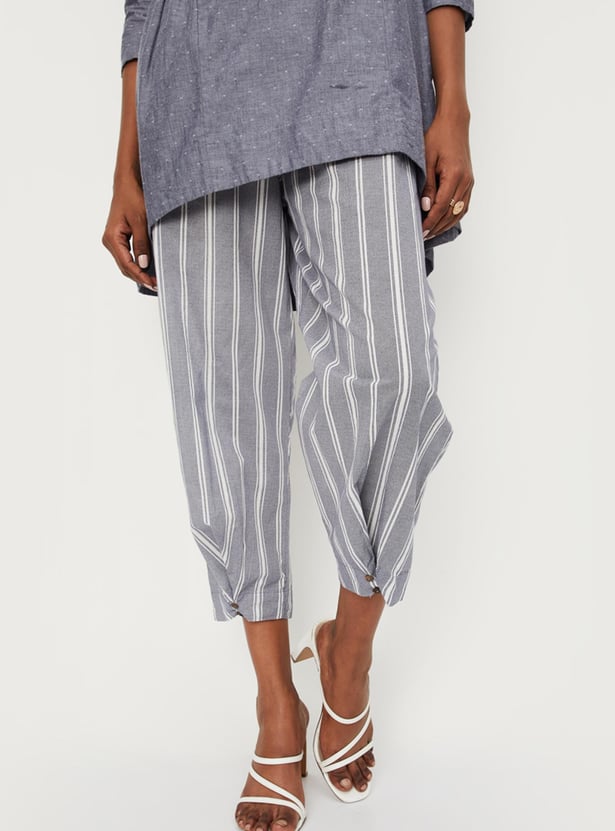 Take your casual styling up a notch with this pair of crop-length pants. Highlighted with a striped pattern, it features a drawstring waist, side pockets, and a buttoned hem. Style these pants with a kurta and heels for a chic look.