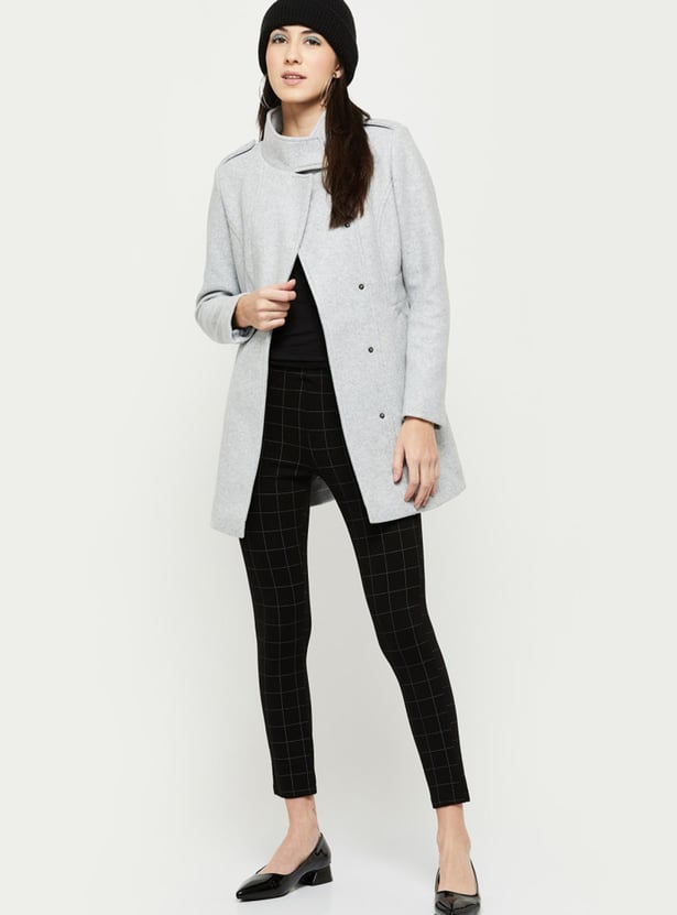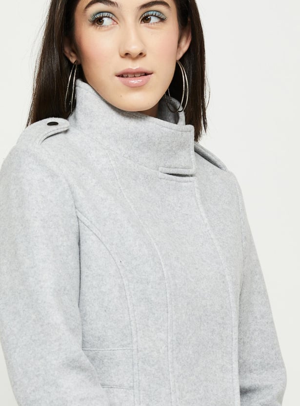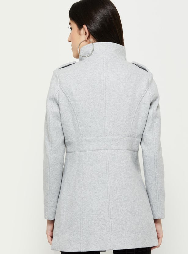 This winter jacket is designed with a high neckline, full sleeves, button placket, and insert pockets.