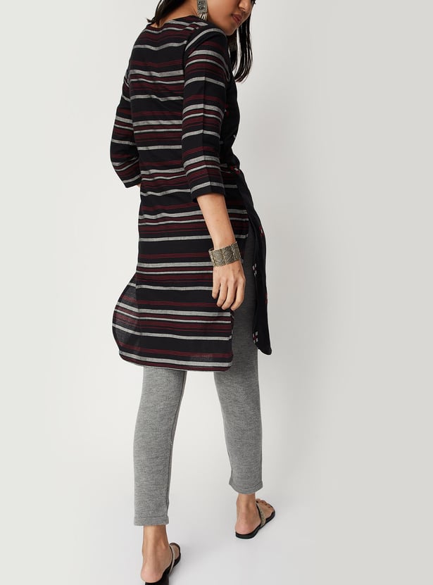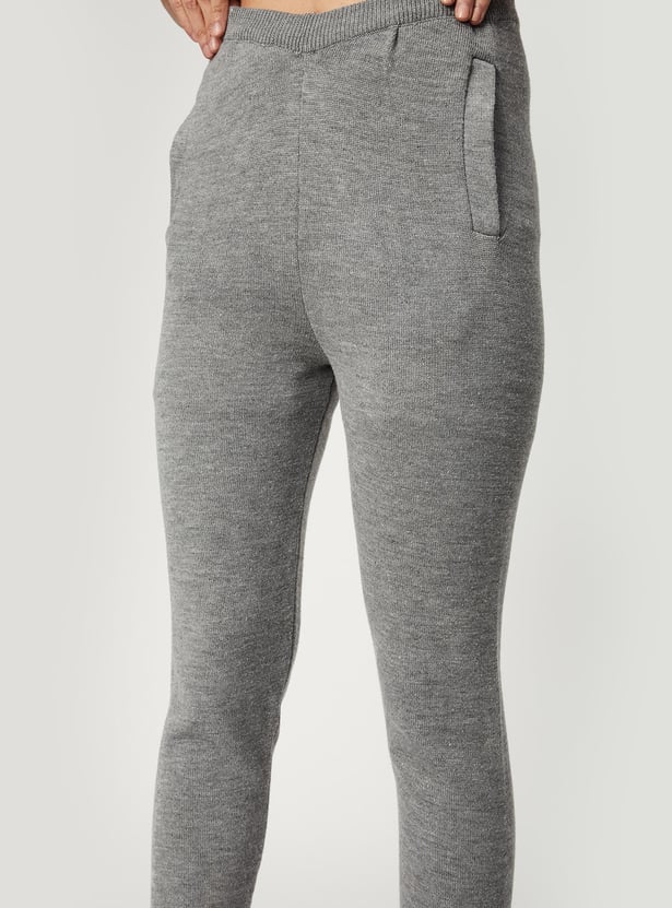 Cosy up your winter wardrobe with this pair of leggings. It features a knit pattern, ribbed waist, side pockets, and ankle-length profile. Team up these leggings with a kurta and ethnic sandals to complete the look.