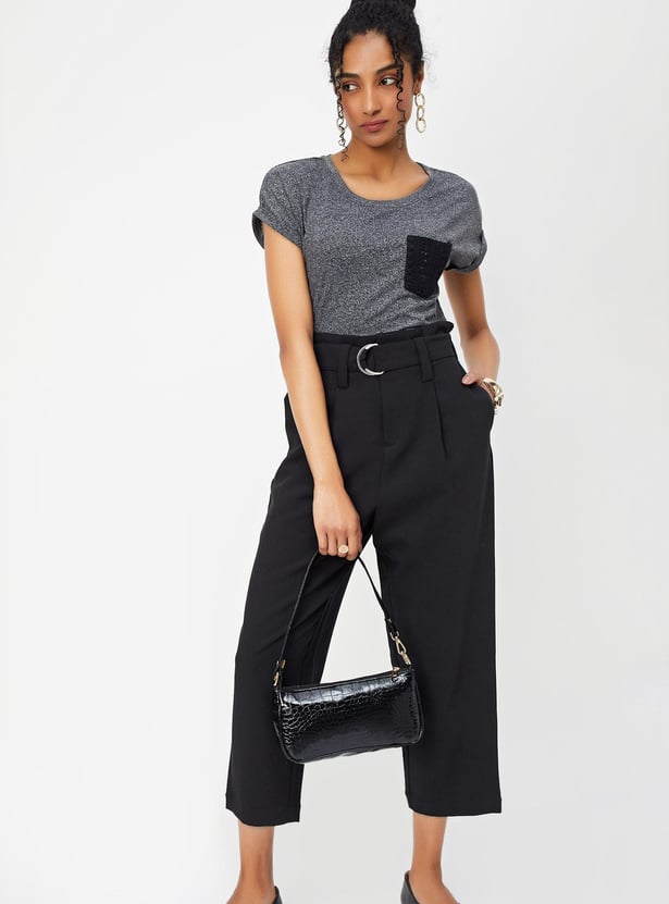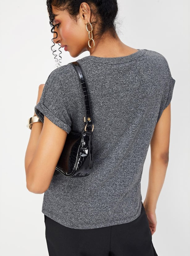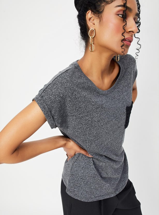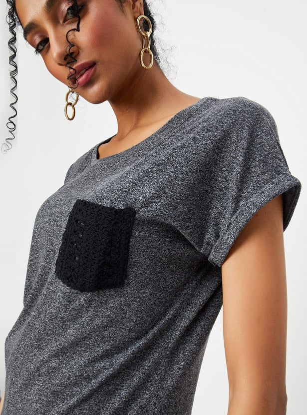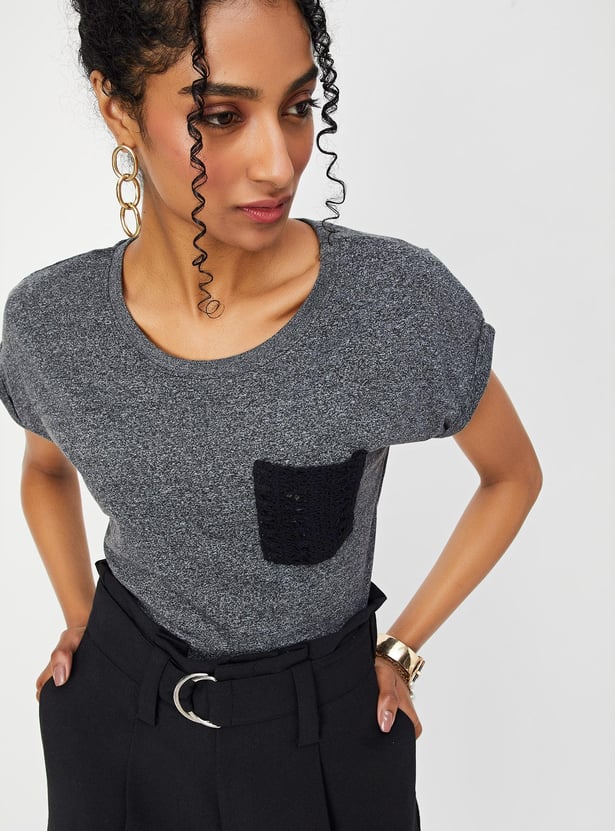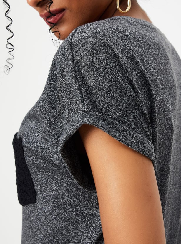 Upgrade your sense of fashion with this textured T-shirt. It is styled with a round neckline, extended sleeves, and a crochet patch pocket on the chest.
