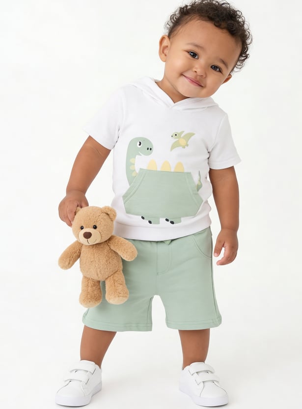 Let your little one roar into casual cool with this fun printed shorts set. The set features a dinosaur-printed T-shirt with a hood, embossed detailing, half sleeves, and a contrasting kangaroo pocket. Paired with matching shorts designed with a drawstring waist and cross pockets, it’s a playful and practical outfit for everyday adventures.