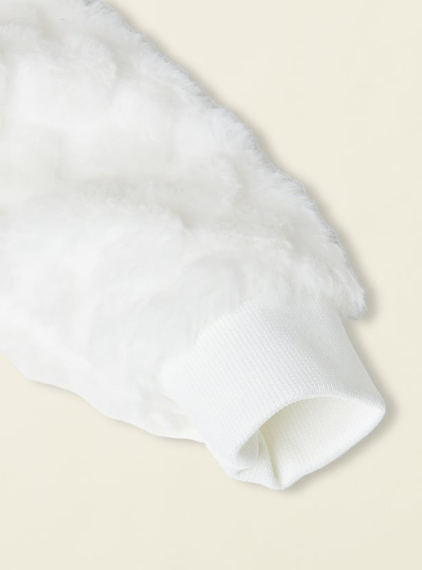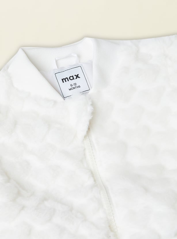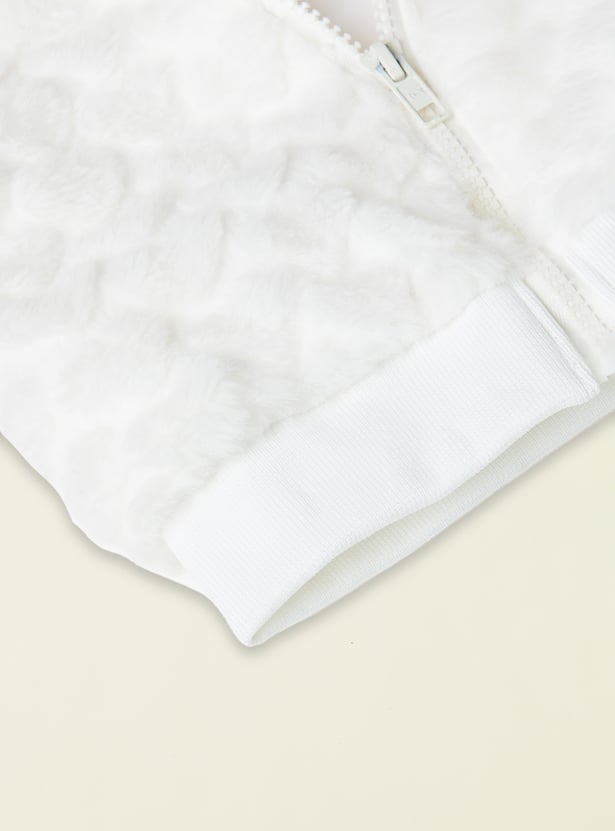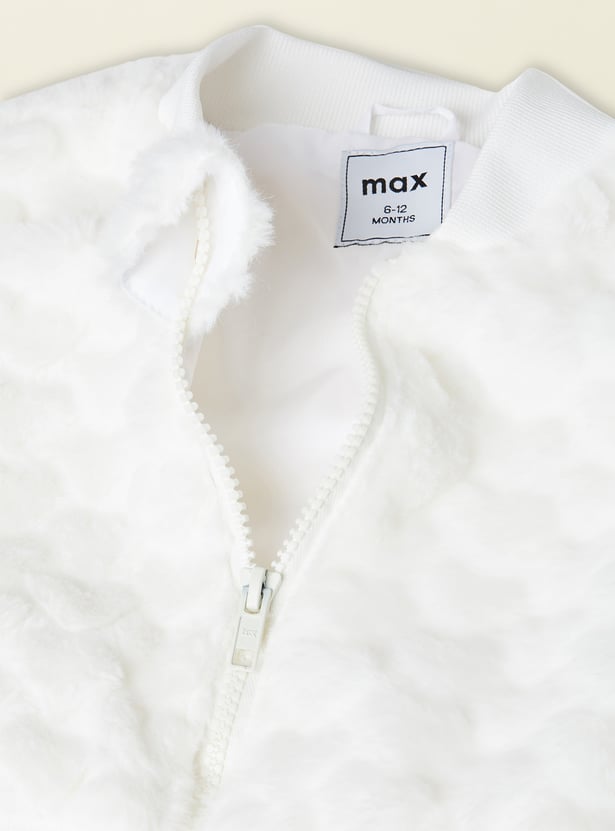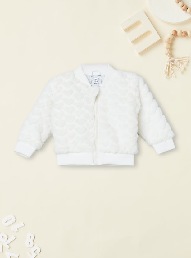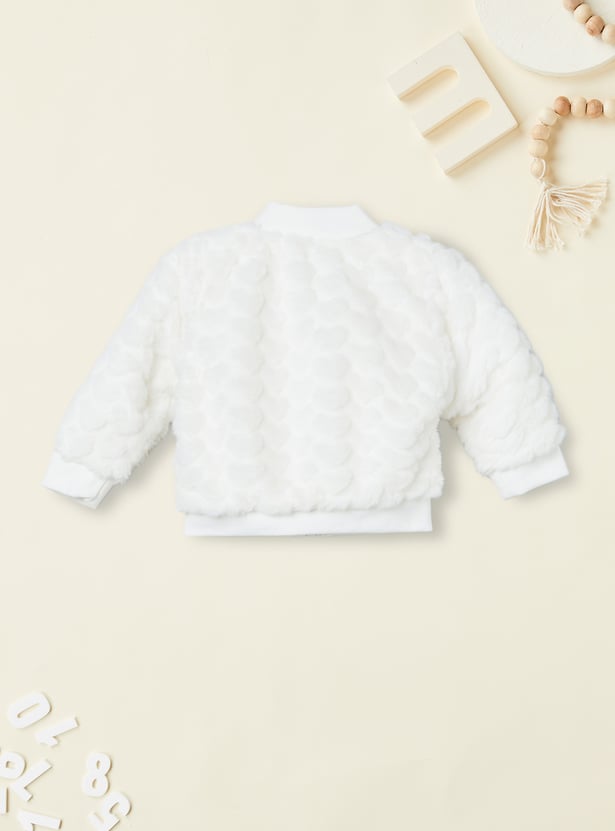 Warmth meets playful style in this jacket. Featuring a playful fuzzy heart design, it boasts a classic baseball collar, full sleeves, and ribbed trim for a snug, comfortable fit.