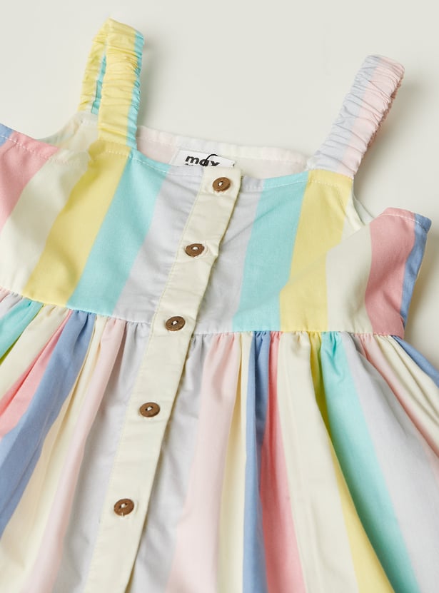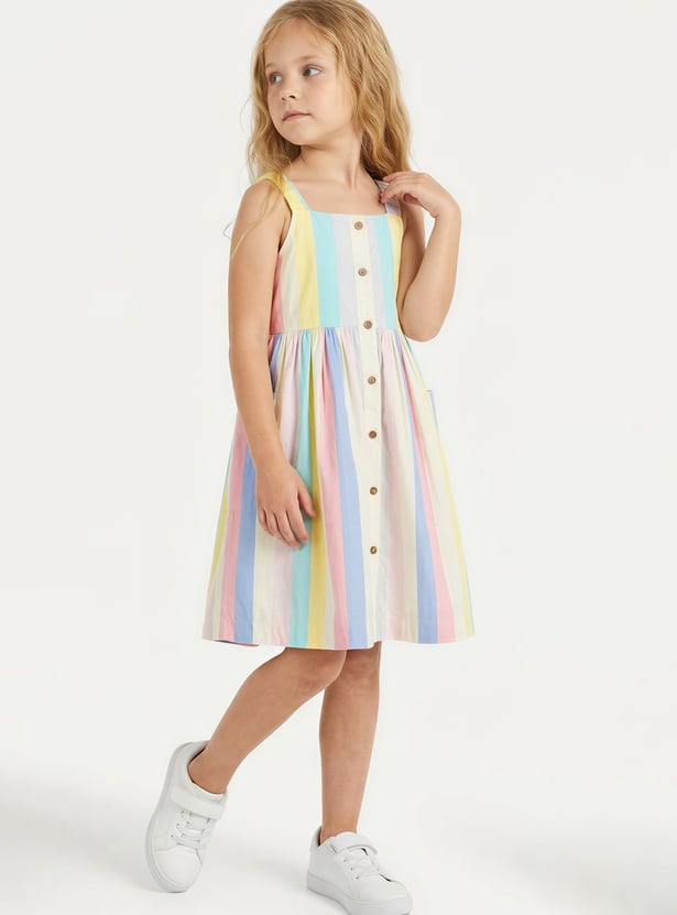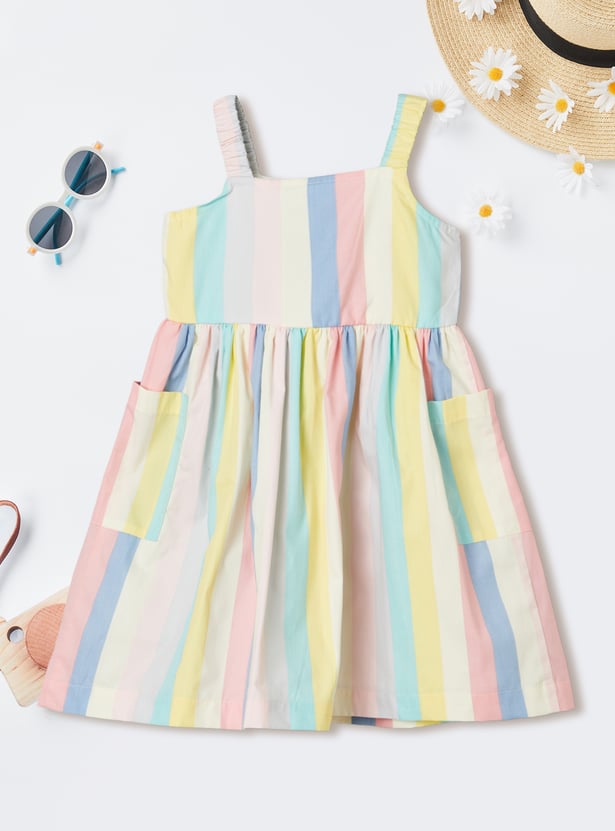 This poplin striped dress features a sleeveless square neckline and a fit-and-flare A-line silhouette for easy movement. Designed with two functional pockets, it blends everyday comfort with a clean, playful shape.