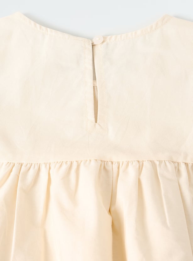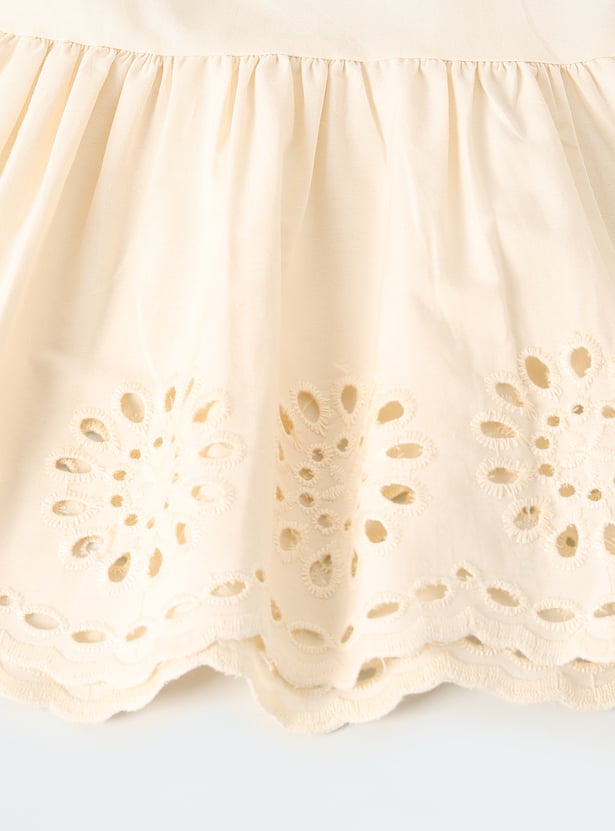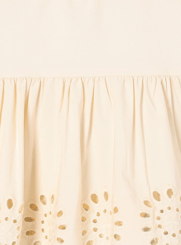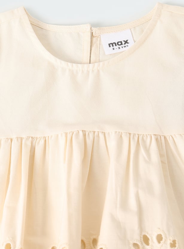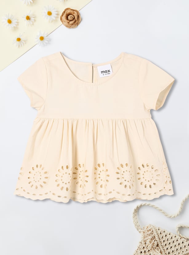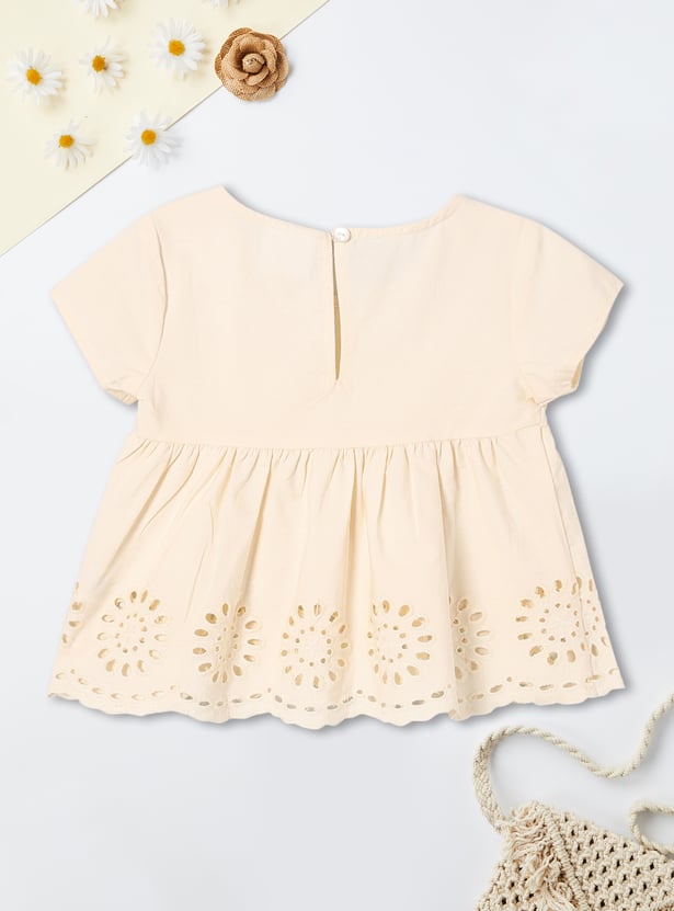 This Schiffli embroidered top features intricate, delicate embroidery that adds a touch of elegance to any outfit. With a round neck and half sleeves, it offers a perfect balance of style and comfort, making it ideal for both casual and dressier occasions.