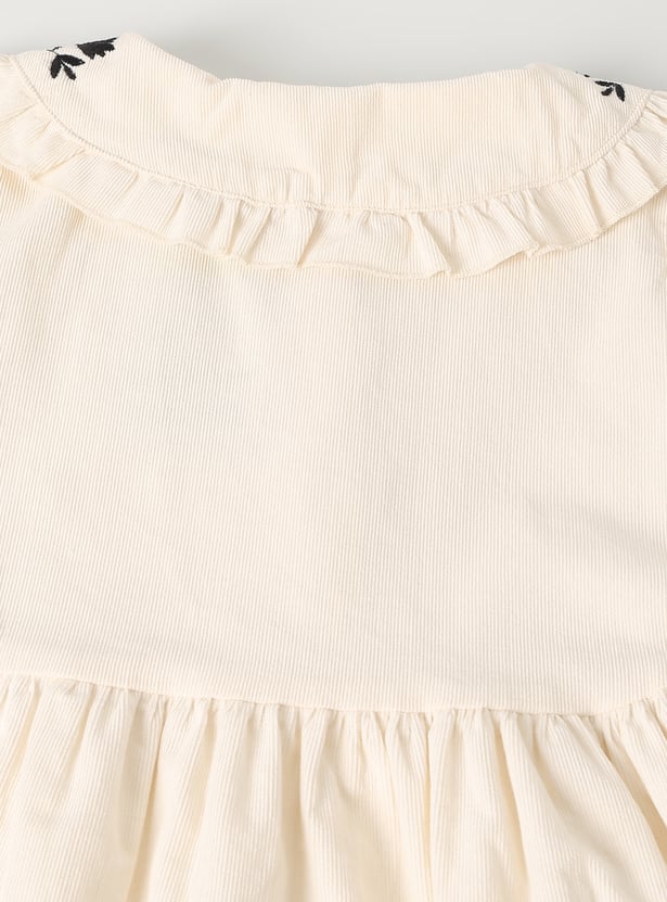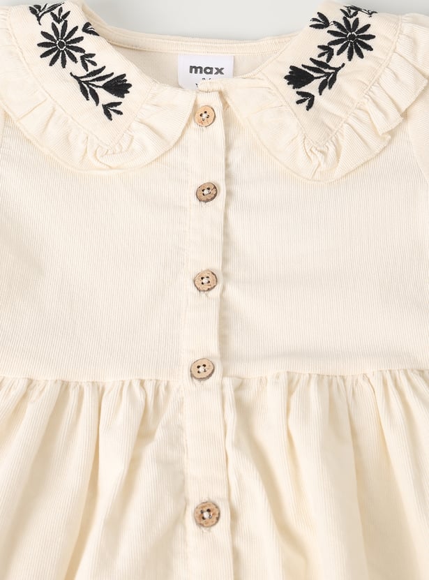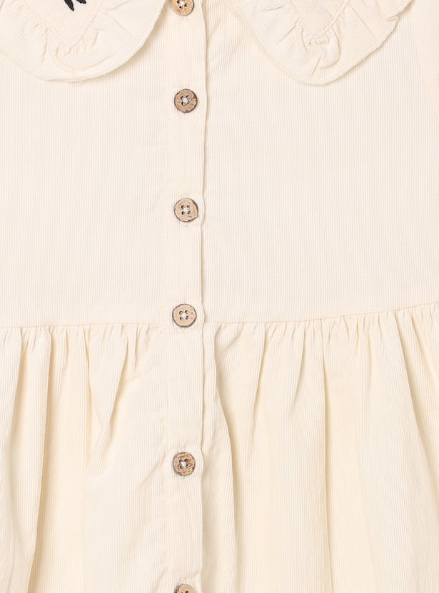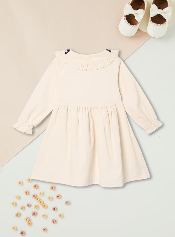 This girls solid dress brings a touch of elegance to everyday wear. Designed with full sleeves featuring elasticated wrists, it has a button-down front, embroidered collar detail, and a gathered waist for a graceful, knee-length silhouette.