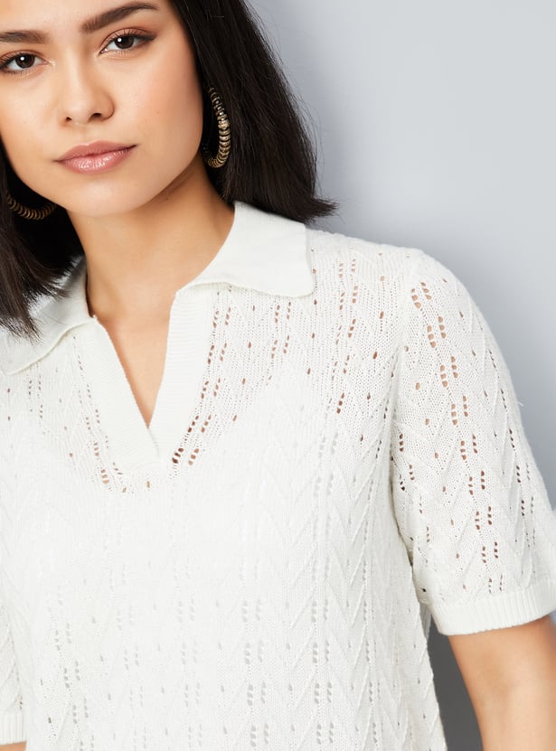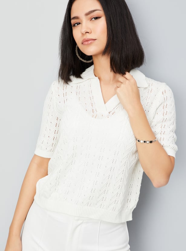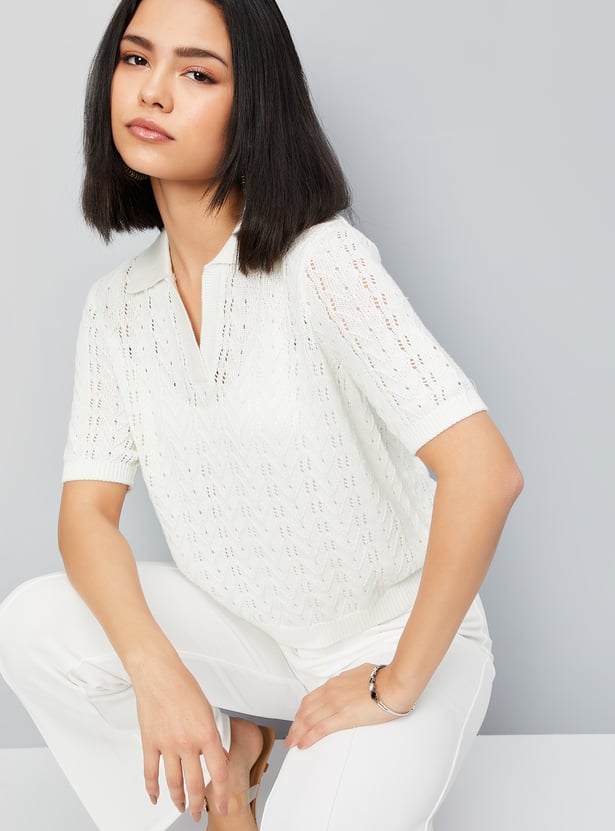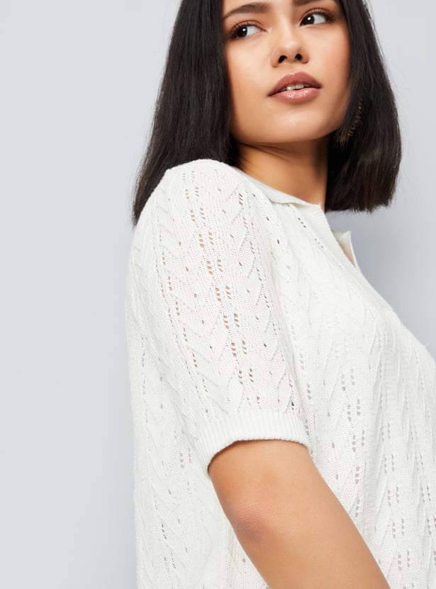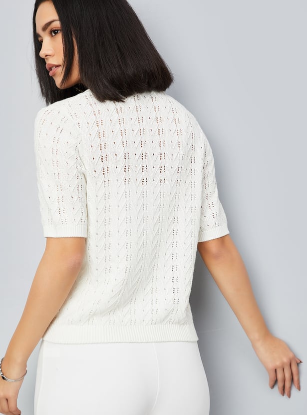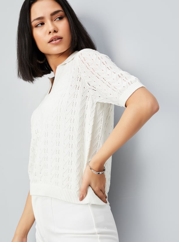 Stay stylish and comfy with this knit crochet t-shirt! It features a Johnny collar and half sleeves and is the perfect piece for layering or wearing solos. the ribbed trim adds to the visual appeal and offers a snug fit. Model Size :