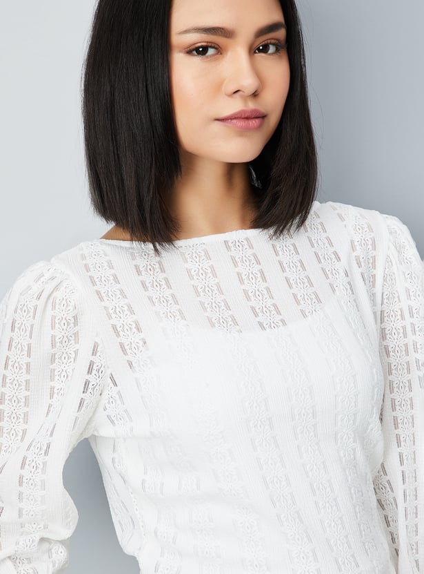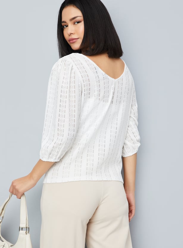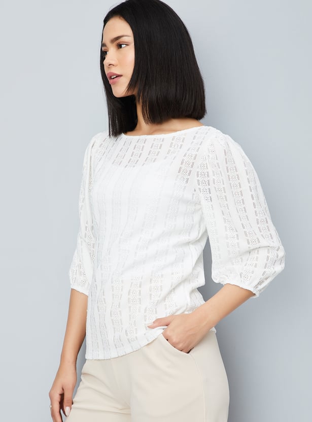 This knit top with floral patterns perfectly combines comfort and style. It features a round neck and 3/4th puffed sleeves and a flattering fit that's versatile enough for casual or layered looks.