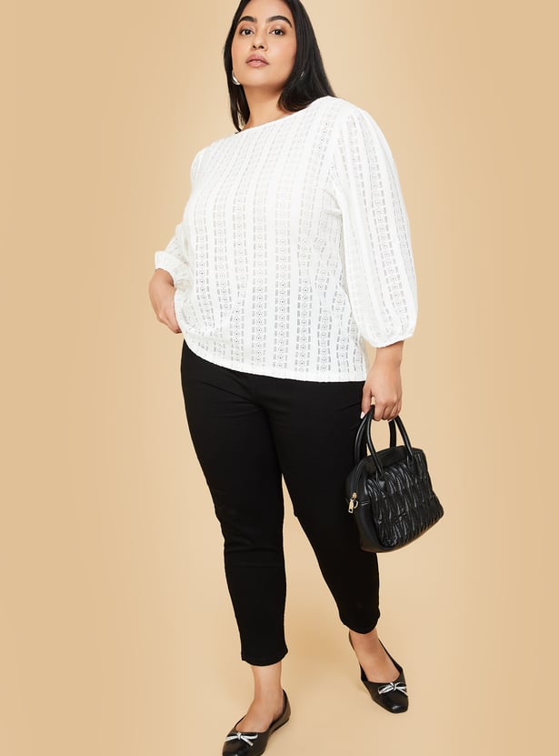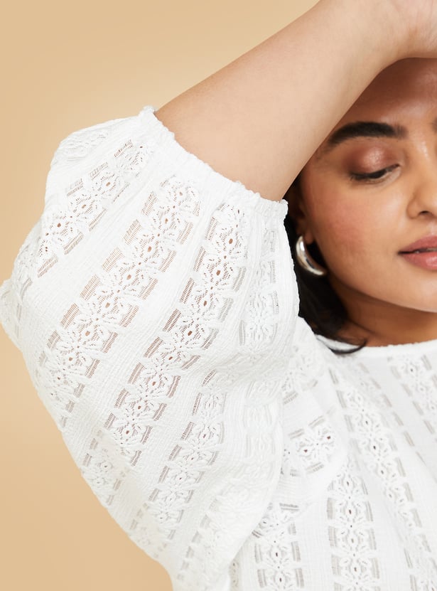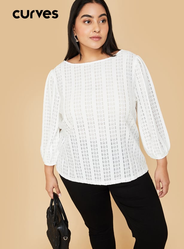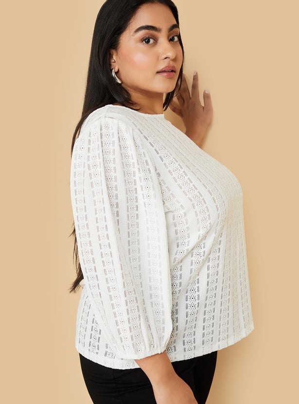 This knit top with floral patterns perfectly combines comfort and style. It features a round neck and 3/4th puffed sleeves and a flattering fit that's versatile enough for casual or layered looks.