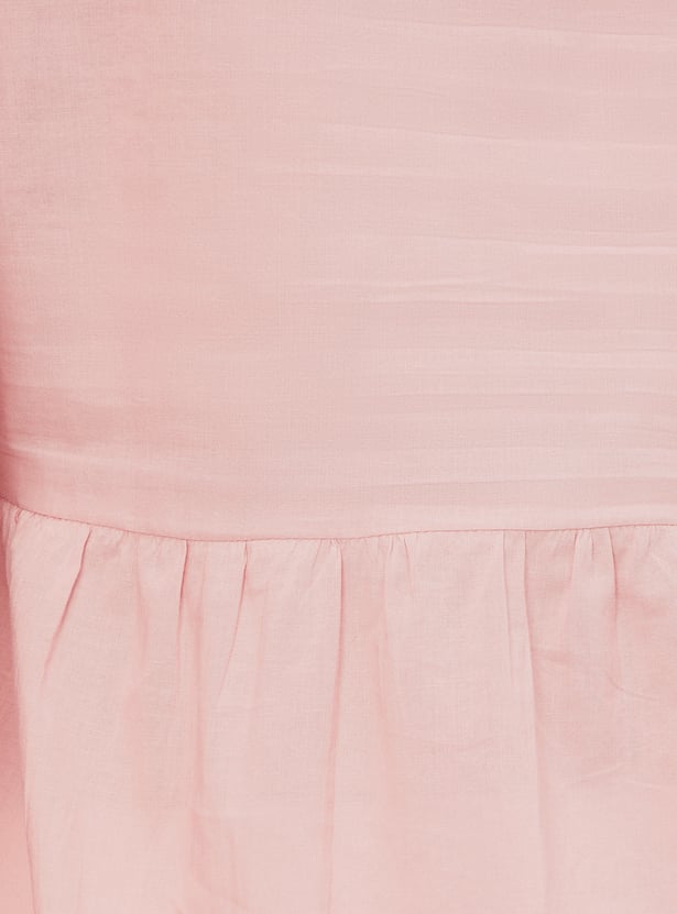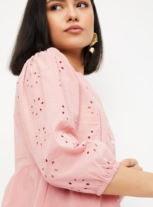 Add a feminine touch to your wardrobe with this Schiffli peplum top. This top combines delicate embroidery with a stylish, structured design. It features a flattering mandarin collar and balloon sleeves that create a soft, romantic silhouette.