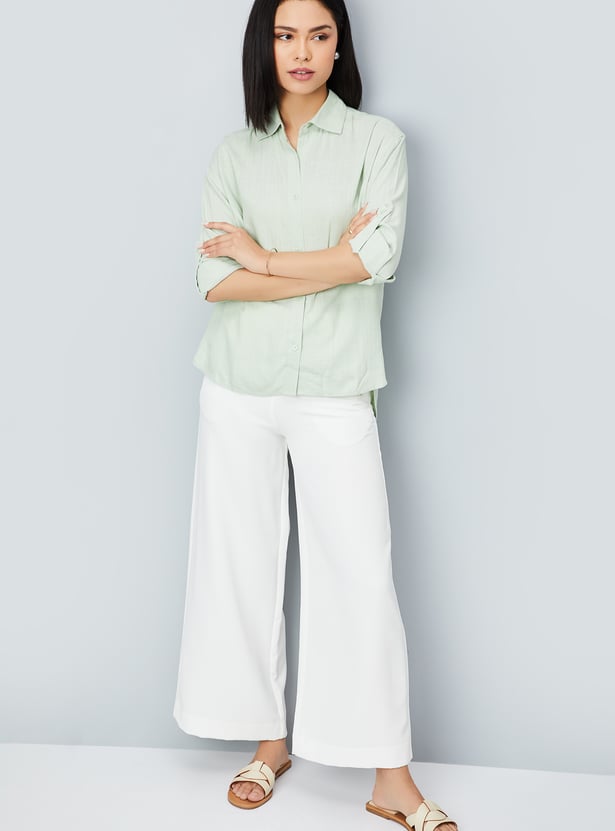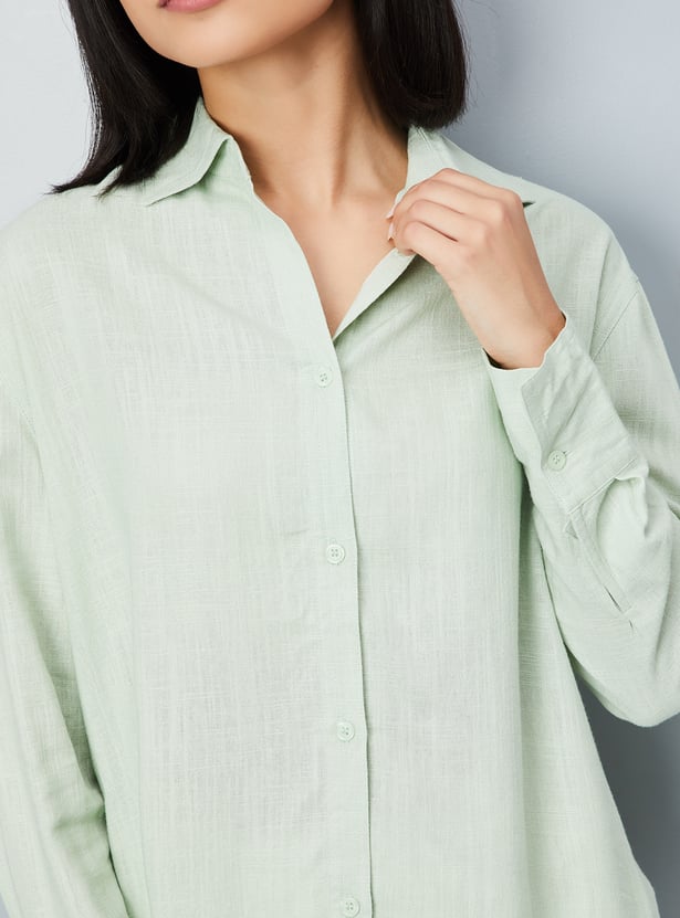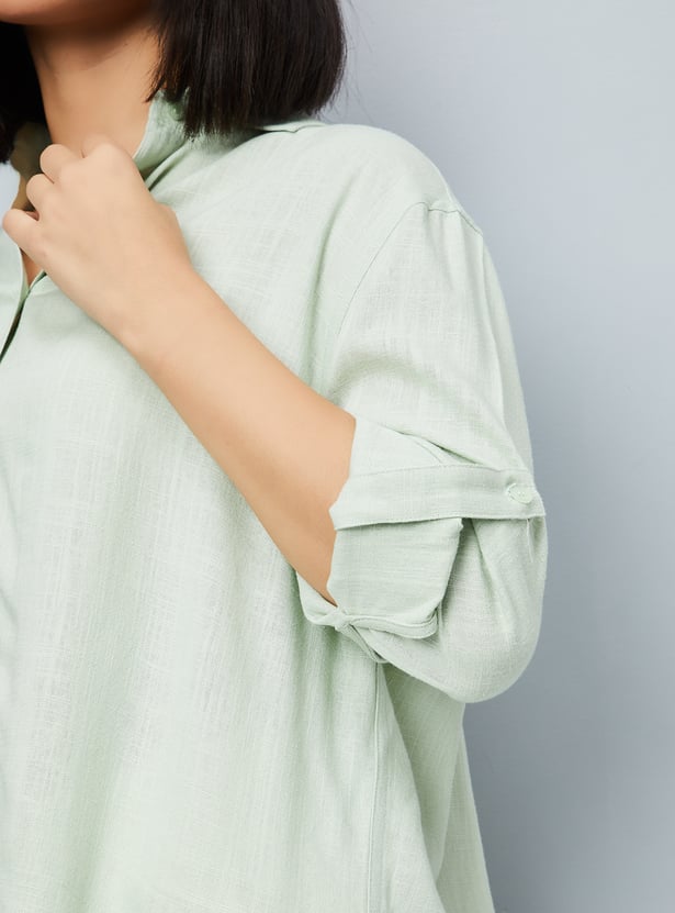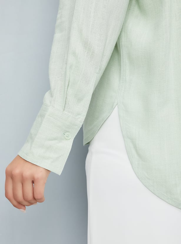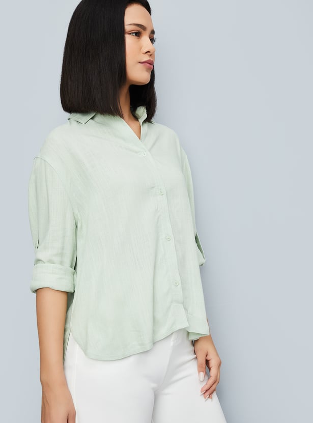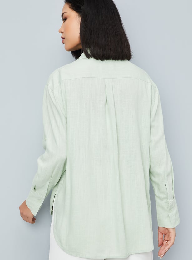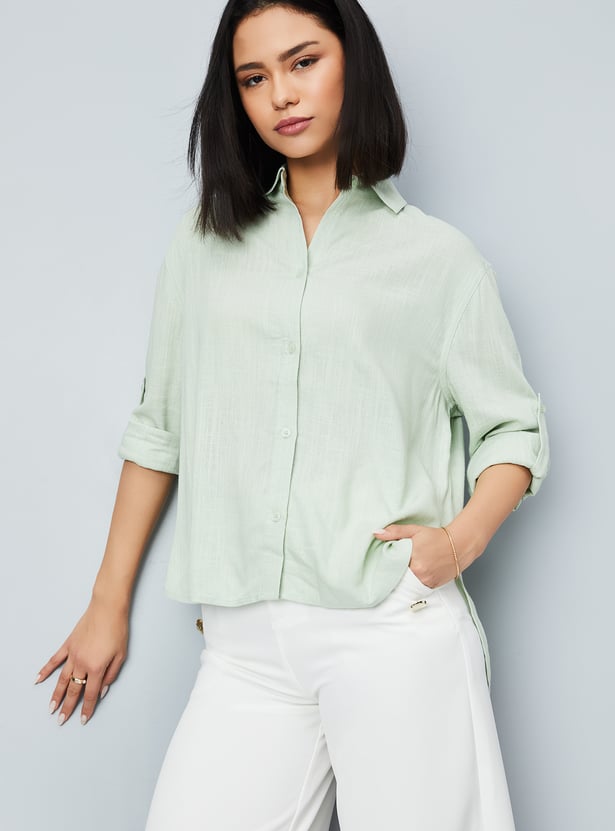 Your go-to piece for laid-back style, this shirt showcases a textured design. The oversized fit offers a relaxed, effortless look. This shirt features a spread collar, full sleeves with roll tabs, and a high-low hem. Model Size :