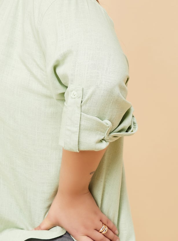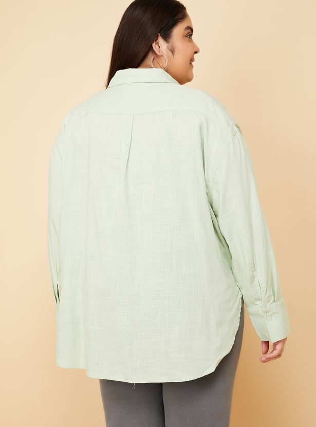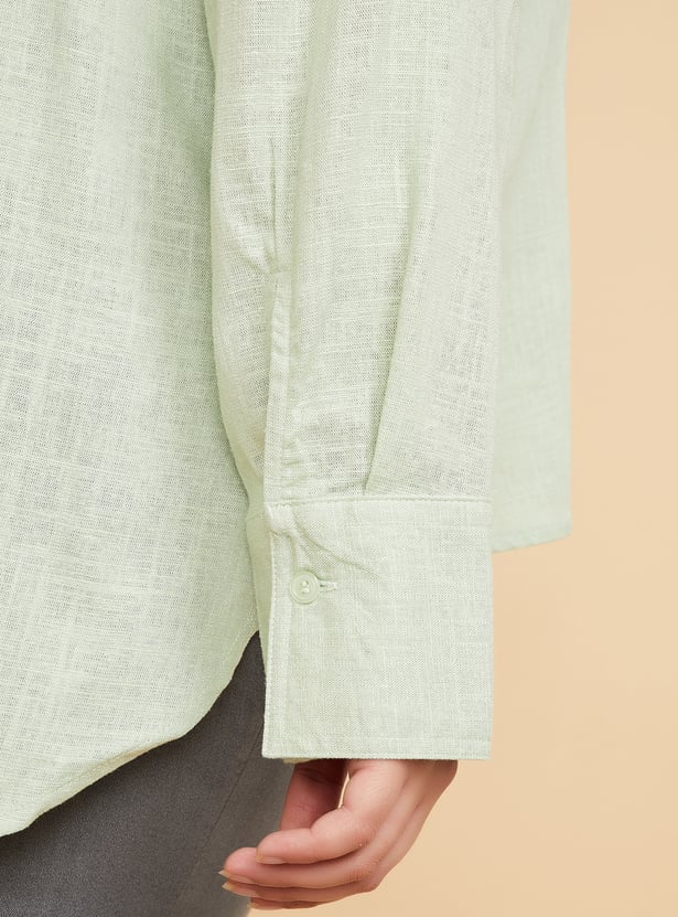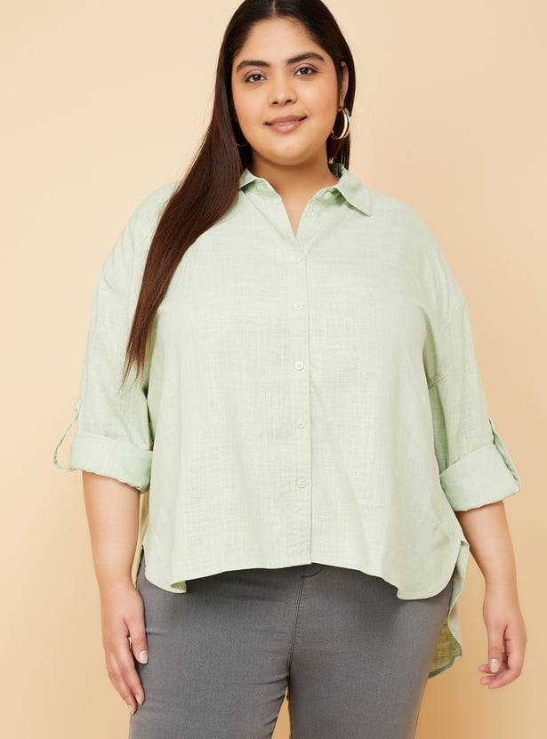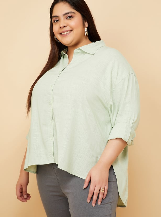 Your go-to piece for laid-back style, this shirt showcases a textured design. The oversized fit offers a relaxed, effortless look. This shirt features a spread collar, full sleeves with roll tabs, and a high-low hem. Model Size :