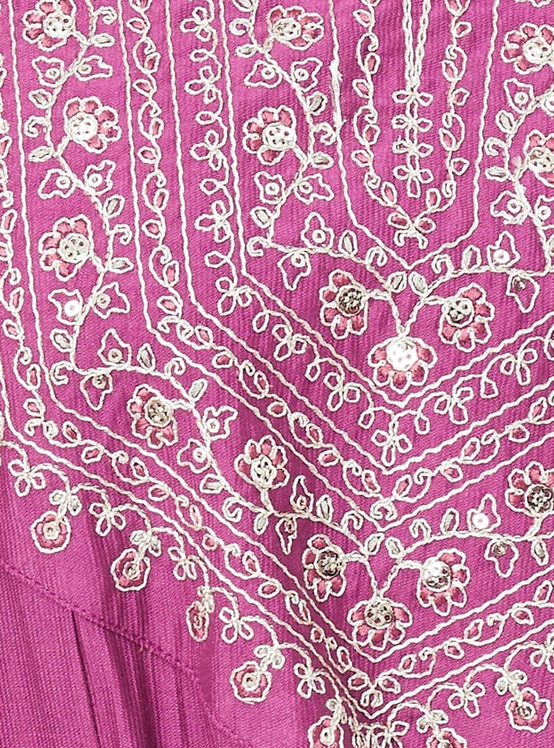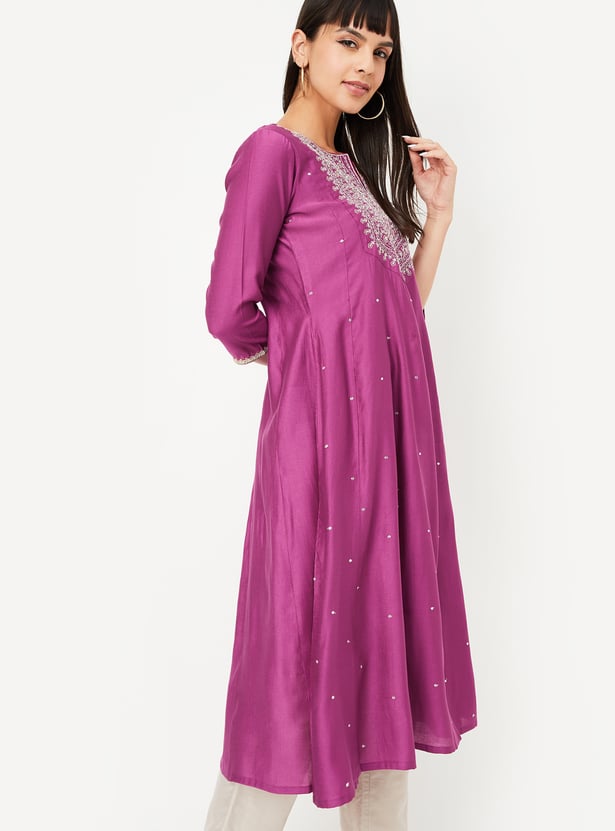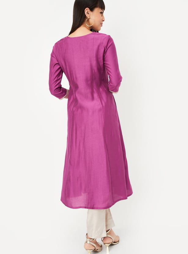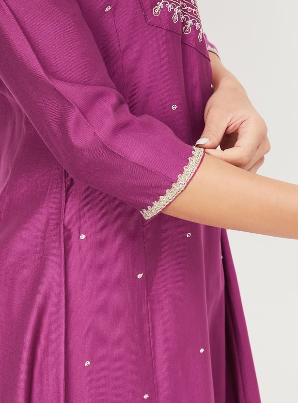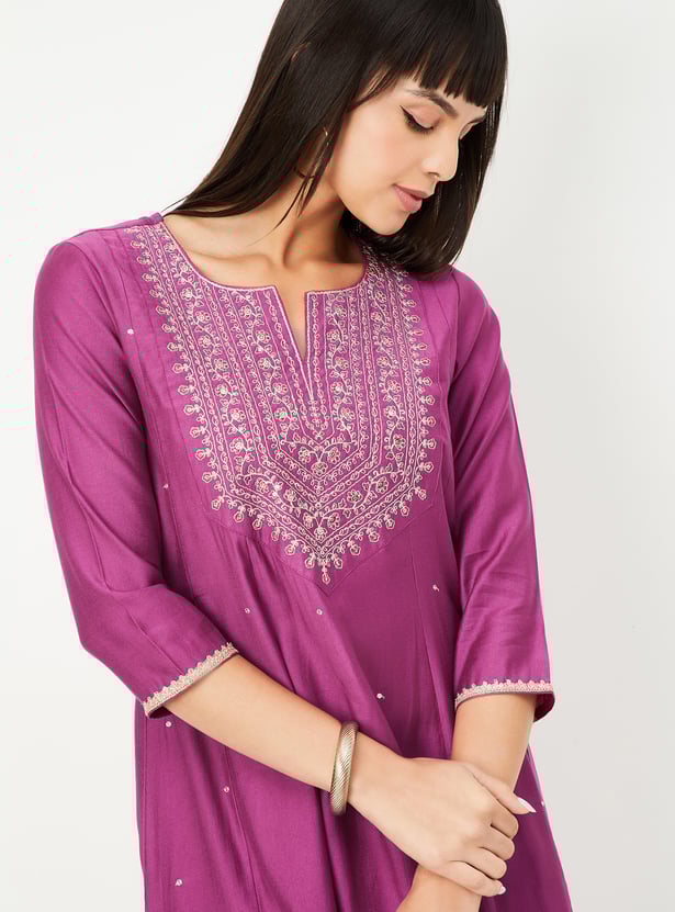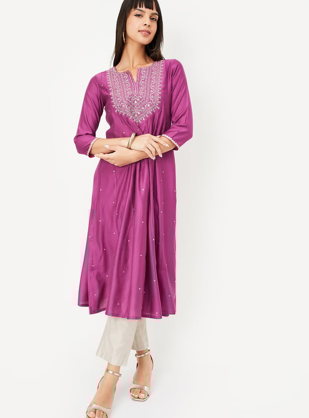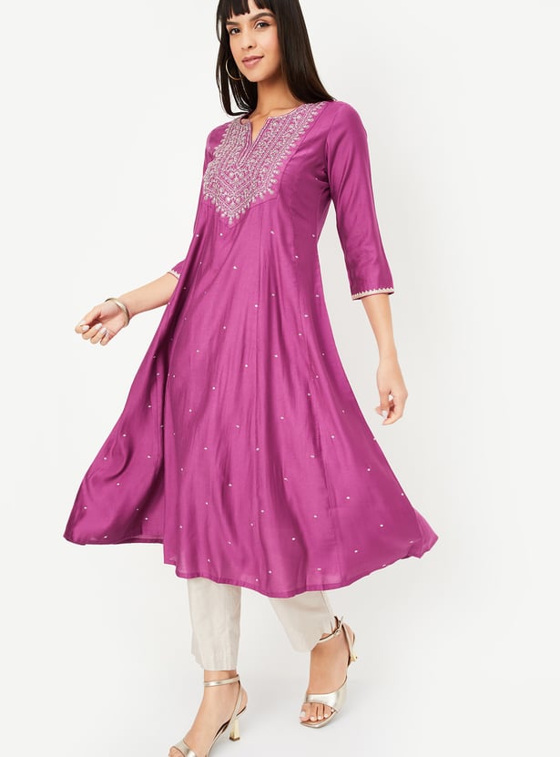 Add a touch of grace to your wardrobe with this embroidered kalidar kurta. Featuring a notch neck and 3/4th sleeves, it offers a flattering fit perfect for everyday elegance.