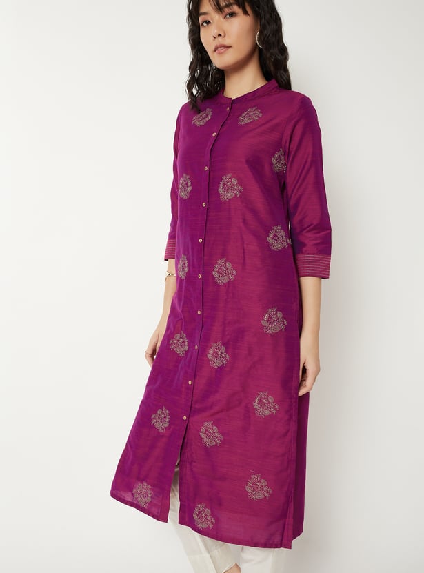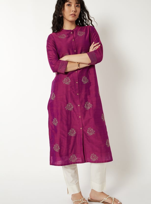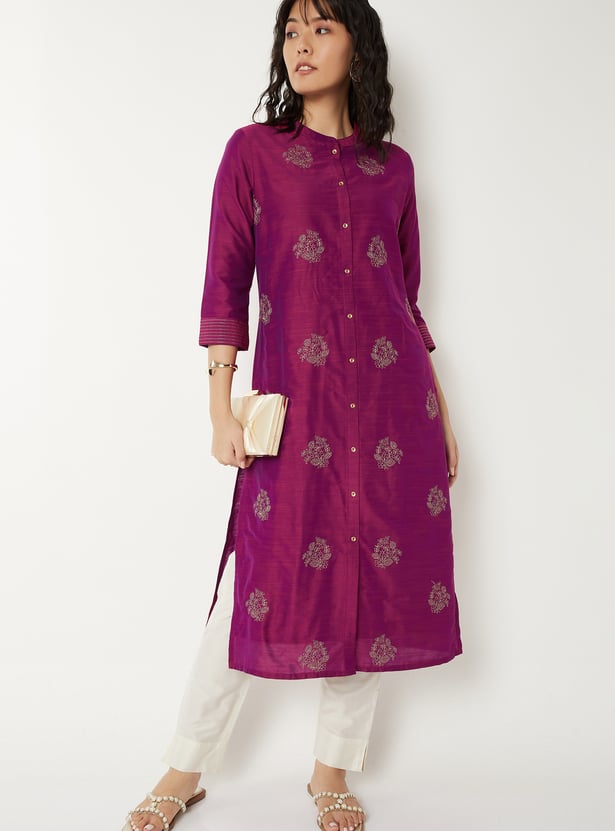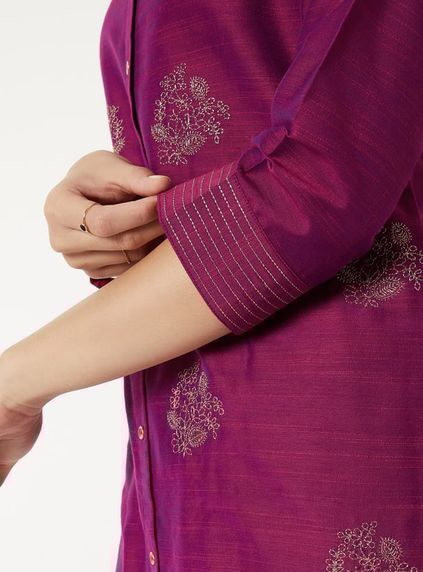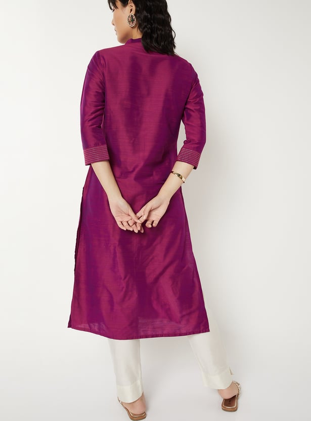 Elegant straight kurta adorned with delicate embroidery for a refined look. Designed with a band collar, three-quarter sleeves, and side slits for ease of movement. Finished with a button placket, making it perfect for both casual and festive occasions.