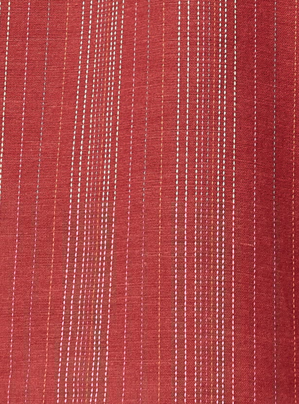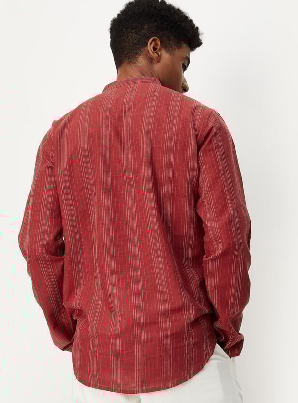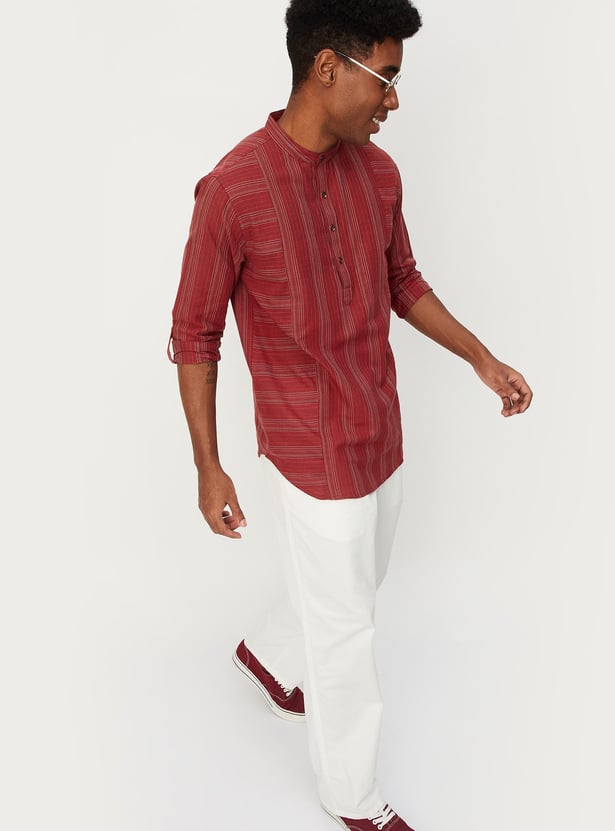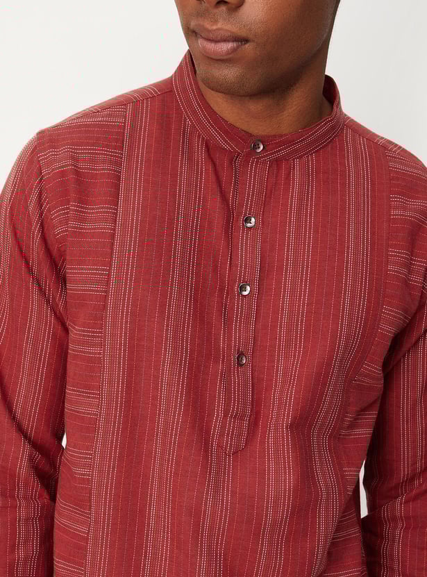 Nail your fusion looks with this short kurta. It features yarn-dyed striped embroidery, a band collar, full sleeves with button tabs, and a curved hem. Style this kurta with trousers and sneakers to complete the look.