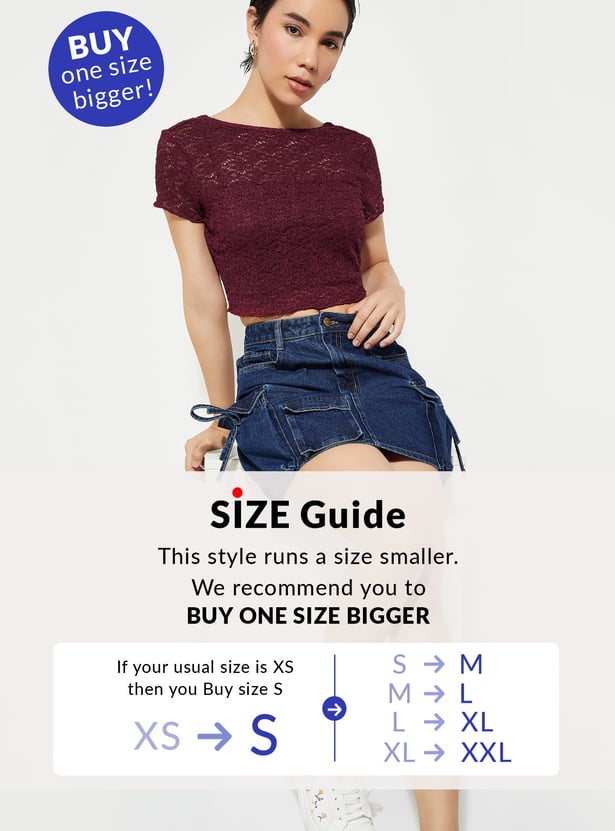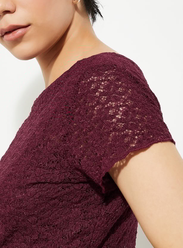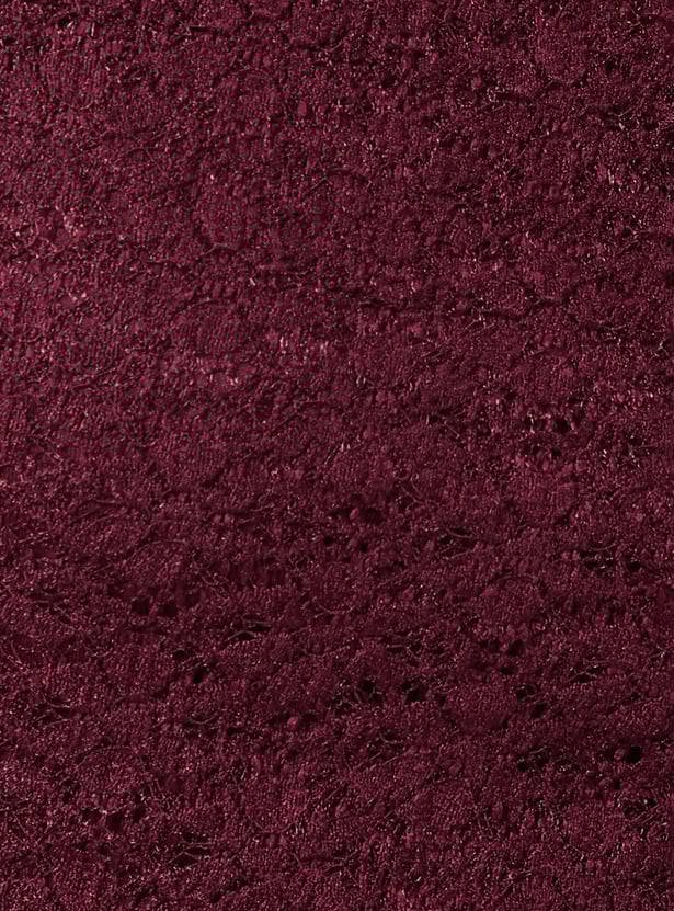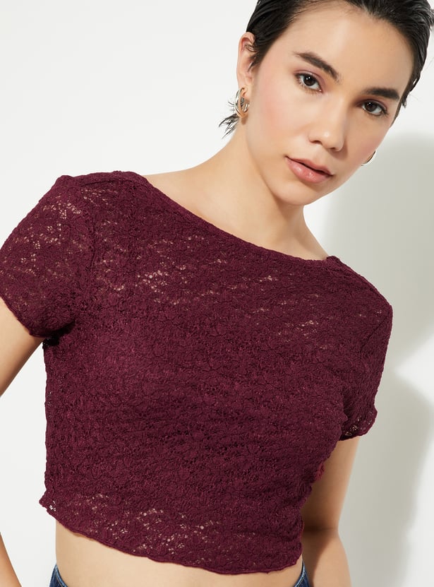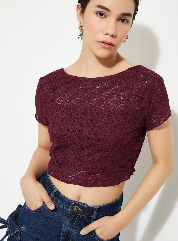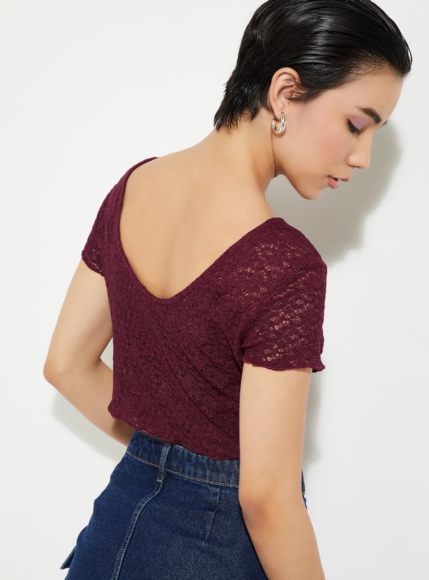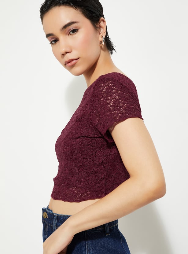 Switch up your style with this top. The delicate lace fabric adds a soft, romantic touch, while the round neck and half sleeves offer a classic silhouette. The scoop back gives a modern, subtle twist. The camisole provides added coverage.