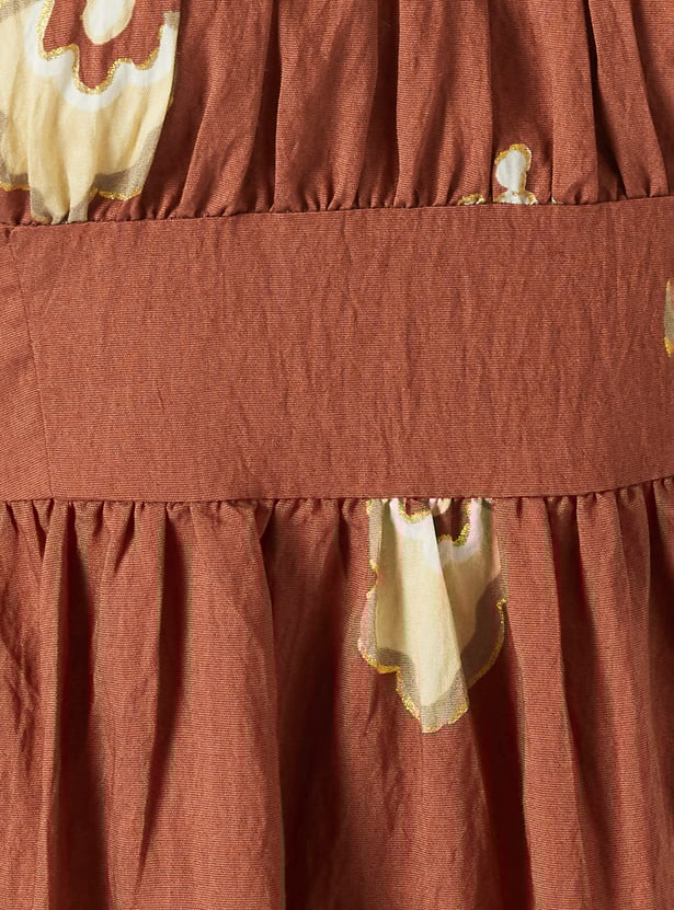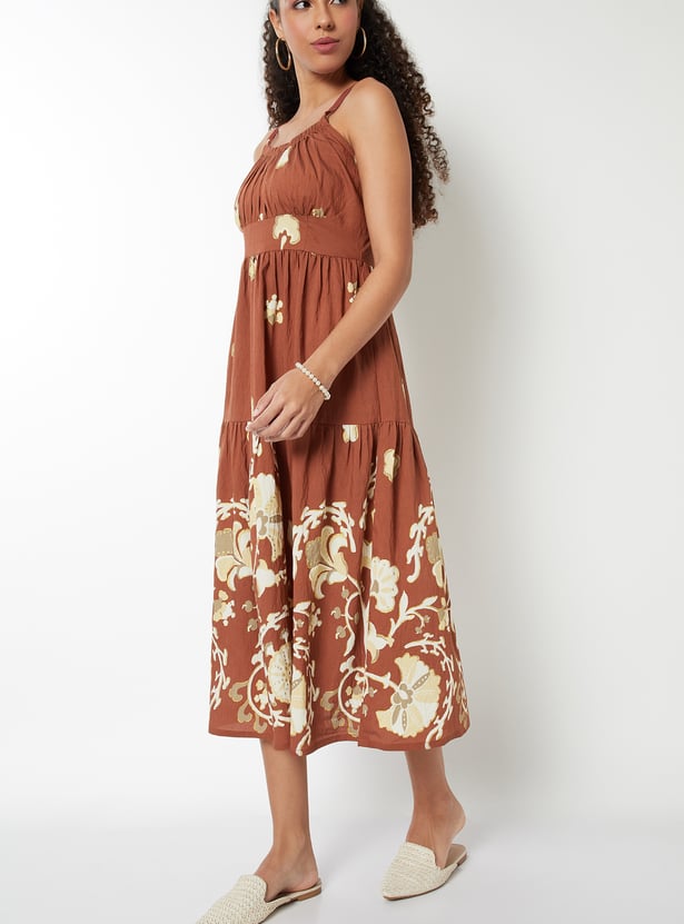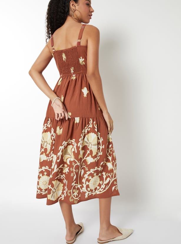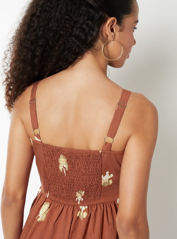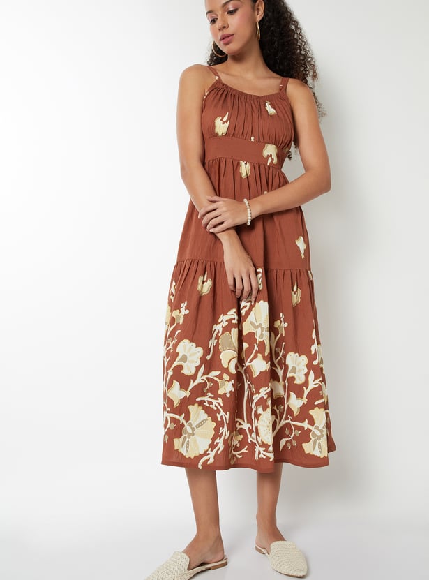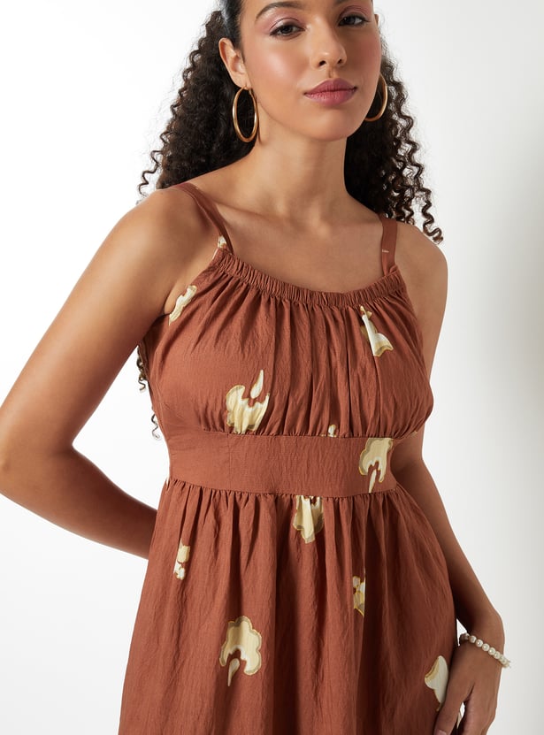 This printed A-line dress is all about breezy elegance and effortless charm. Designed with a square neck, delicate spaghetti straps, and a flattering midi length, it offers a light, flowy silhouette.