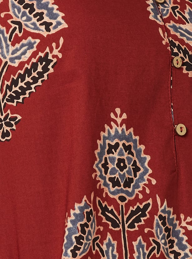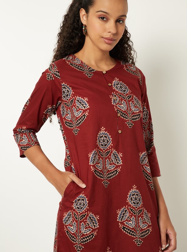 This kurta is a delightful addition to your casual wear collection, featuring a charming print, a classic round neck, three-quarter sleeves, and convenient pockets for a touch of practicality.