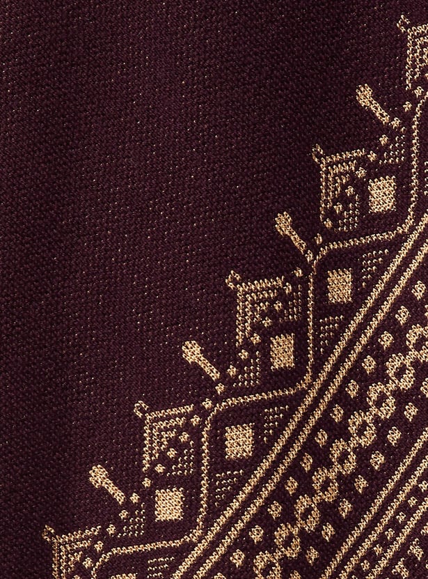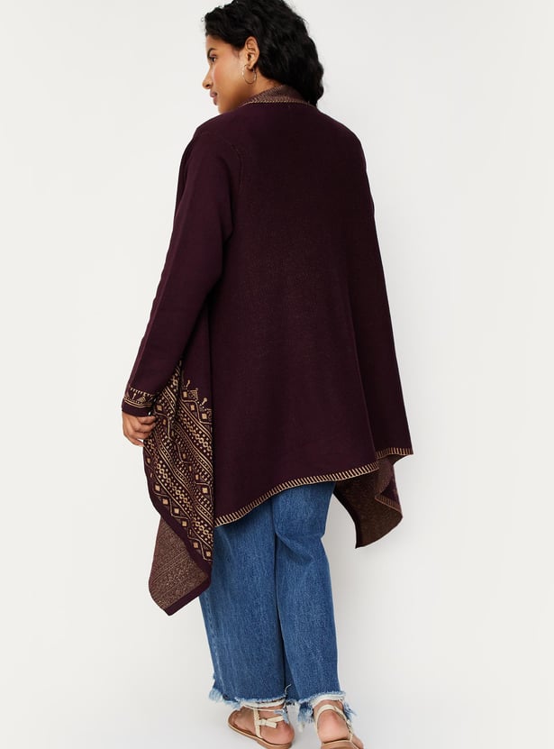 Embrace the season in style with this shrug features a shawl collar, long sleeves, and an asymmetric hem. Cosy up your look this winter by layering this shrug over a kurta and pairing it with leggings and sandals.