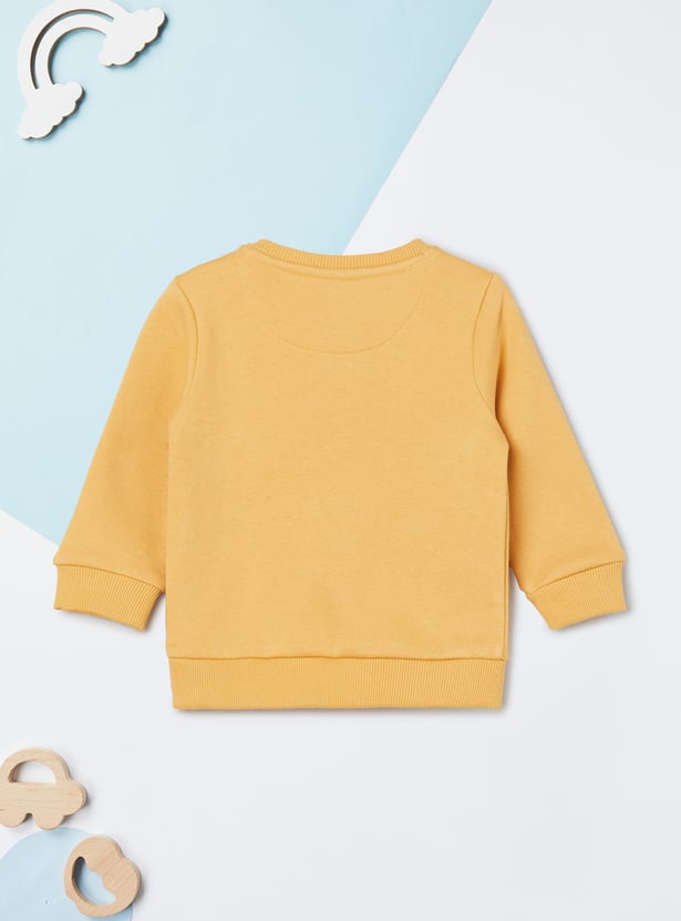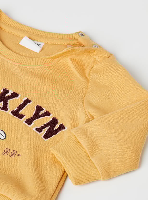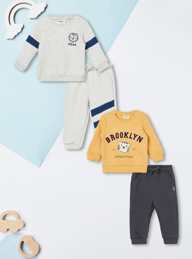 Keep little ones cosy and playful with this sweatshirt and joggers set. This pack of 2 includes two sweatshirts with a crew neck, full sleeves, and ribbed trims for cosy wear. One features an applique and print, while the other showcases an applique at the chest and contrast panels for a playful touch. The joggers come with a drawstring waist and pockets for everyday convenience.