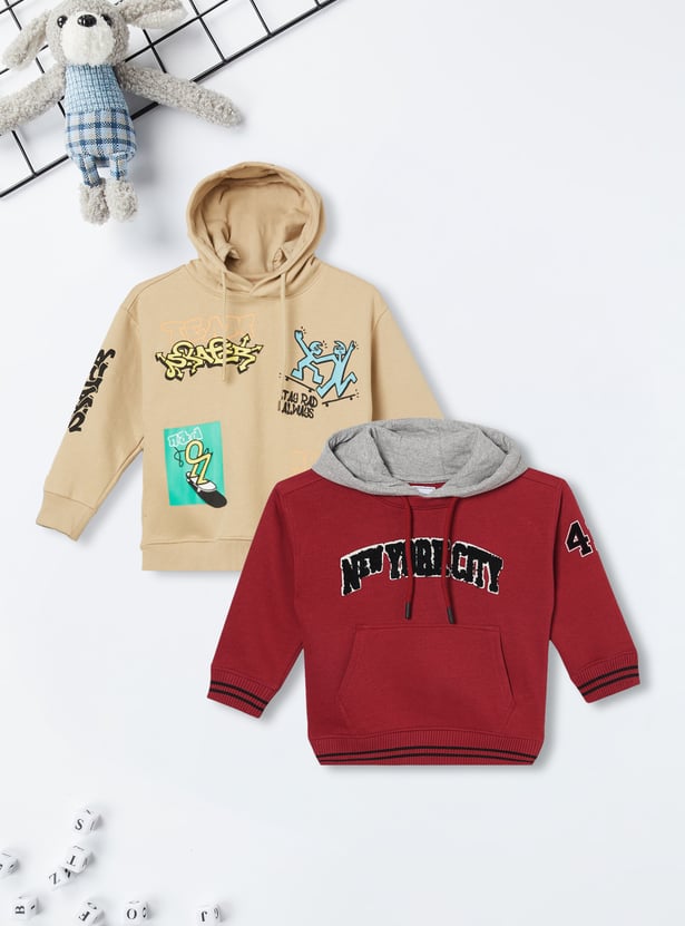 Add a cool and playful update to his casual wardrobe with this pack of hoodies. It includes two styles, one with a graphic print and the other with an applique detail on the chest. They are designed with a hooded neck with drawstrings, full sleeves, and ribbed trims. The applique hoodie also features striped trims and a kangaroo pocket.