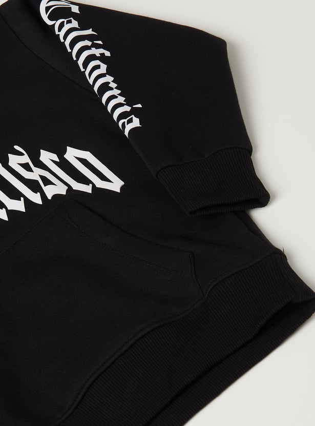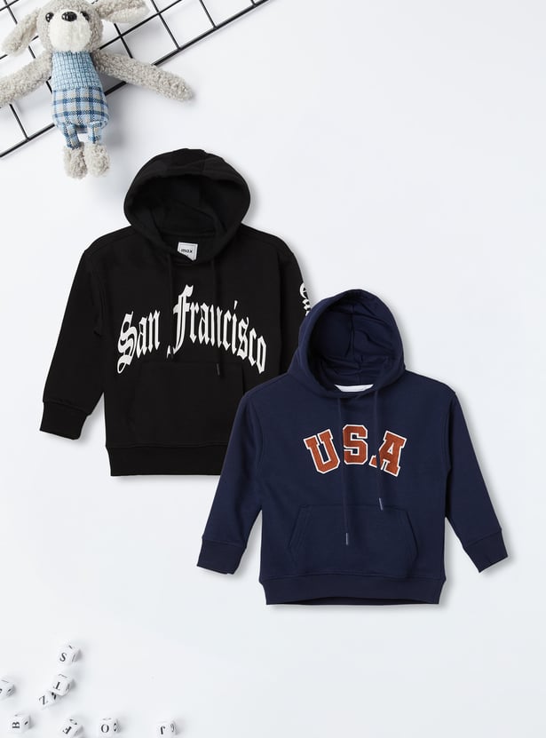 Add a cool and playful update to his casual wardrobe with this pack of hoodies. It includes two styles, one with a graphic print and the other with an applique detail on the chest. They are designed with a hooded neck with drawstrings, full sleeves, and ribbed trims. The applique hoodie also features a kangaroo pocket.