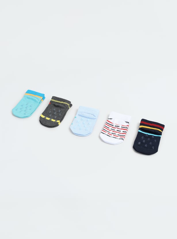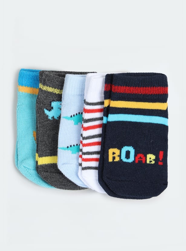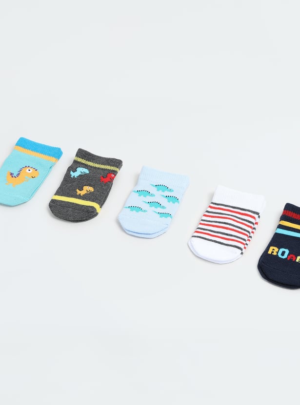 Add cuteness to his outfit with this pack of socks. The assorted prints add a pop of brightness. It has a no-show profile and ribbed cuffs.