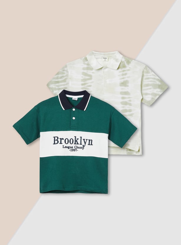 This pack of 2 assorted polo T-shirts offers a fun mix of styles — one with a trendy tie-dye design and the other with a cool, sporty print. Both feature half sleeves and a smart collar, making them perfect for casual days out.